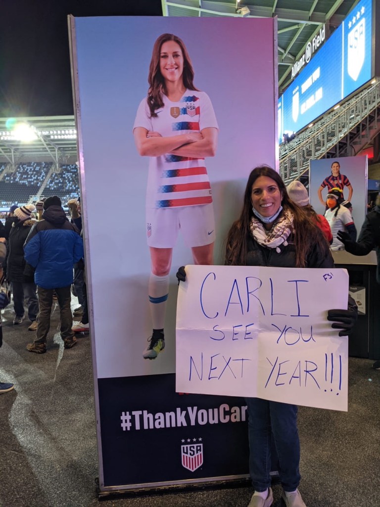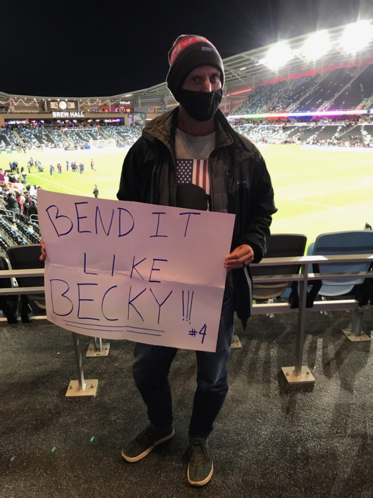 After the game, Carli made an emotional speech and her teammates took a lap around the stadium. Nicole and I made signs. I made one for my favorite player, Becky Sauerbrunn, perhaps the most unassuming player on the team. She is instrumental in the fight for equal pay and is often regarded as the brains of the team. She is a defender and has never scored a goal, so I played into that by making a sign that said, “Bend it like Becky!!!” When she walked by, she pointed and laughed, acknowledging my wittiness no doubt. Nicole had one that said, “See you next year, Carli!!!,” a reference to the notion that Carli is too intense and driven to ever fully step away from the game.