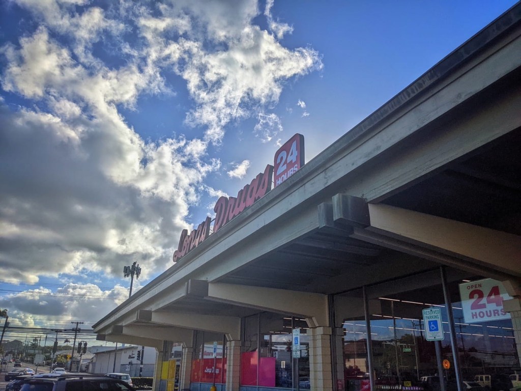 As far as Big Island climate is concerned, Kona is typically the dry, sunny, touristy side of the island, whereas Hilo is very green, rainy, wet, overcast, and much less touristed. However, the weather for our long weekend is flipped from the norm. It was overcast when we left Kona and we arrived in sunny Hilo, something I don’t think I have ever witnessed in my life. After getting settled, we went for a mile and a half walk to a Long’s Drug store. Long’s is like the go-to place for acquiring Locals, the ubiquitous rubber slippers (or Rubbah’ Slippahs as real locals would say). Their selection was unfortunately small as if there is a rubber shortage. They only had tiny or giant sizes. Defeated, we returned to the SCP Hotel.