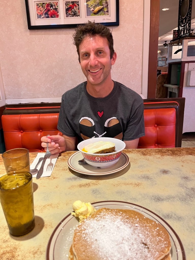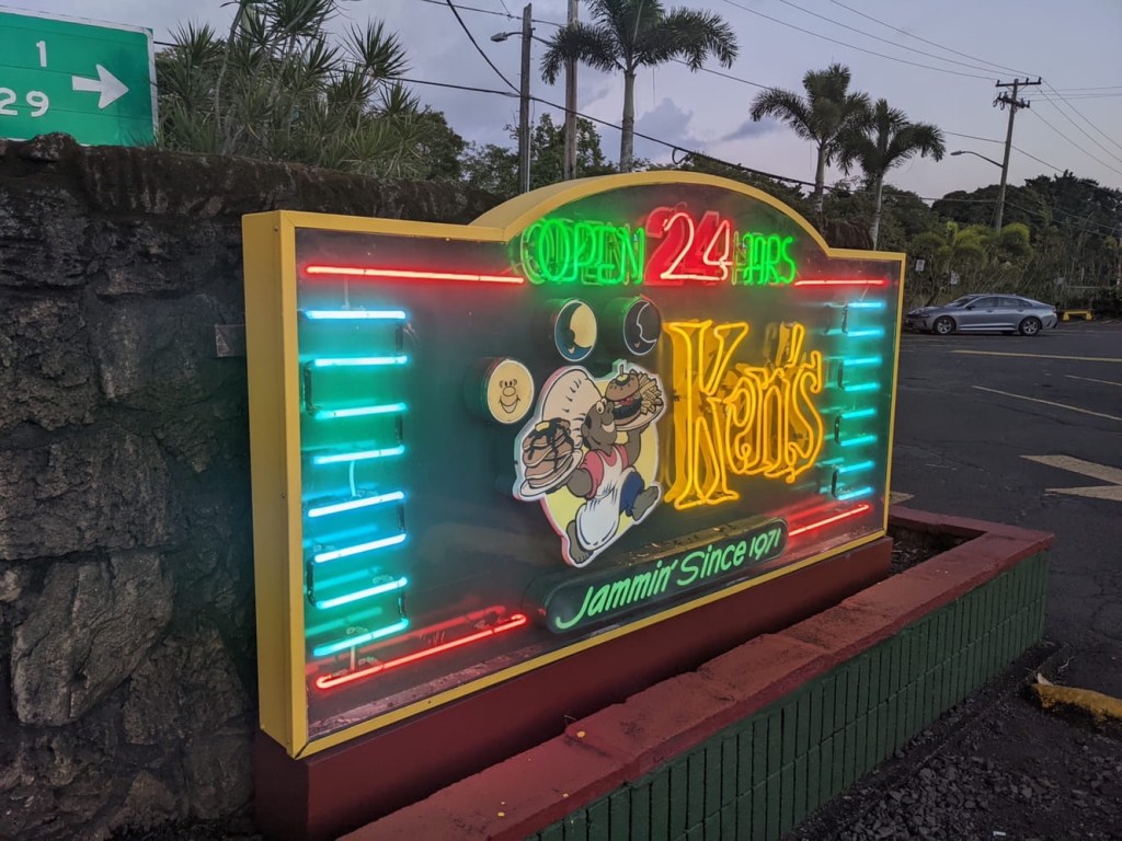 We had dinner at Ken’s House of Pancakes, a local institution which I have frequented on many occasions in my past. Beyond their obvious specialty of pancakes, they also pride themselves on their varieties of loco mocos. That’s why the elderly couple at a nearby table ordered fettuccine alfredo and clam chowder. Nicole and I got a more suitable order of banana pancakes and “original” loco moco.