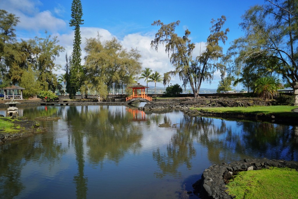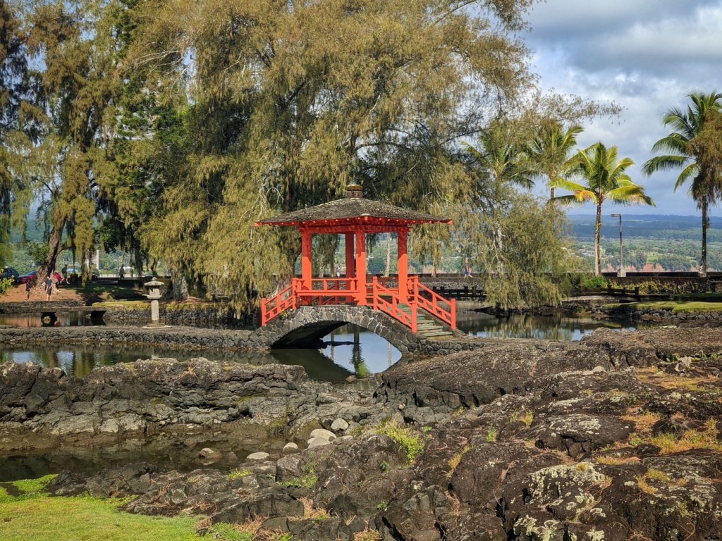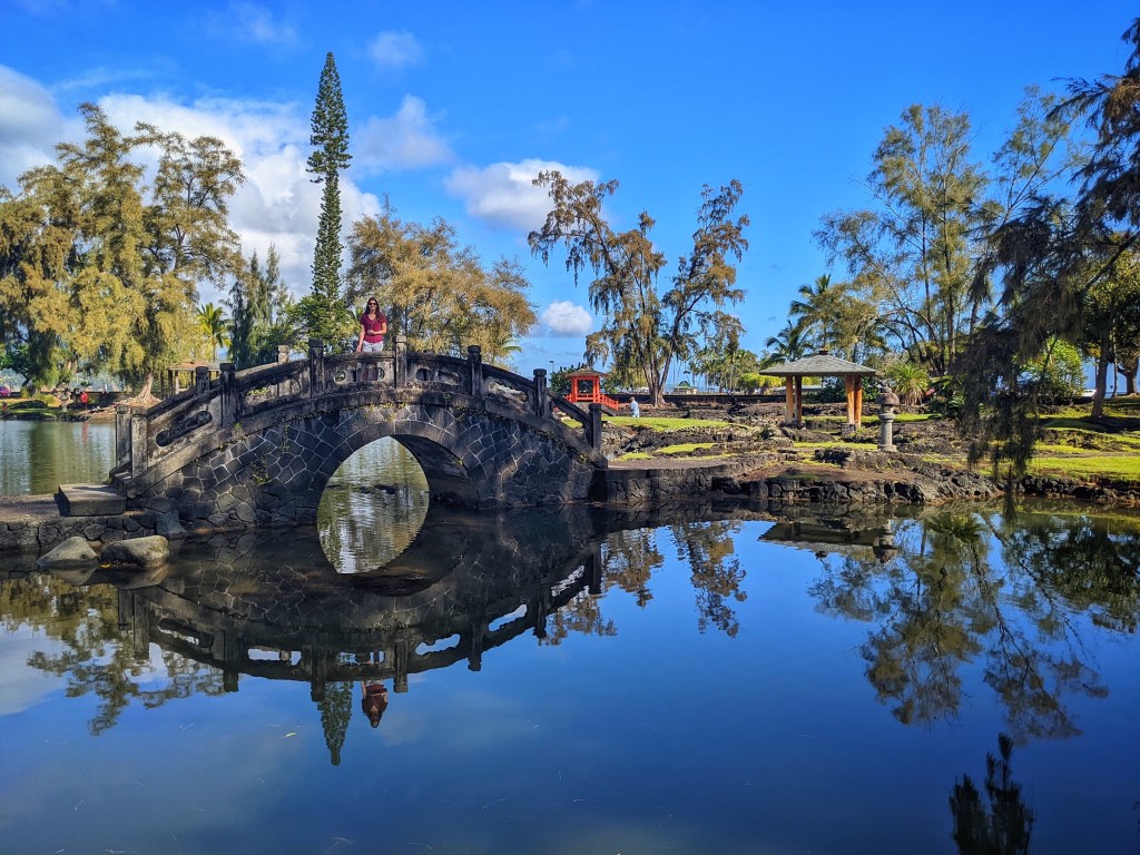 Nicole had to be back at our room and with access to WiFi before 11, so we ventured out to explore Liliuokalani Gardens, a short distance from the SCP Hotel. It was the most crowded I have ever seen the park, most likely because I usually see it in the rain. We walked across the Japanese bridges and amongst the banyan trees while trying to break in our new locals.