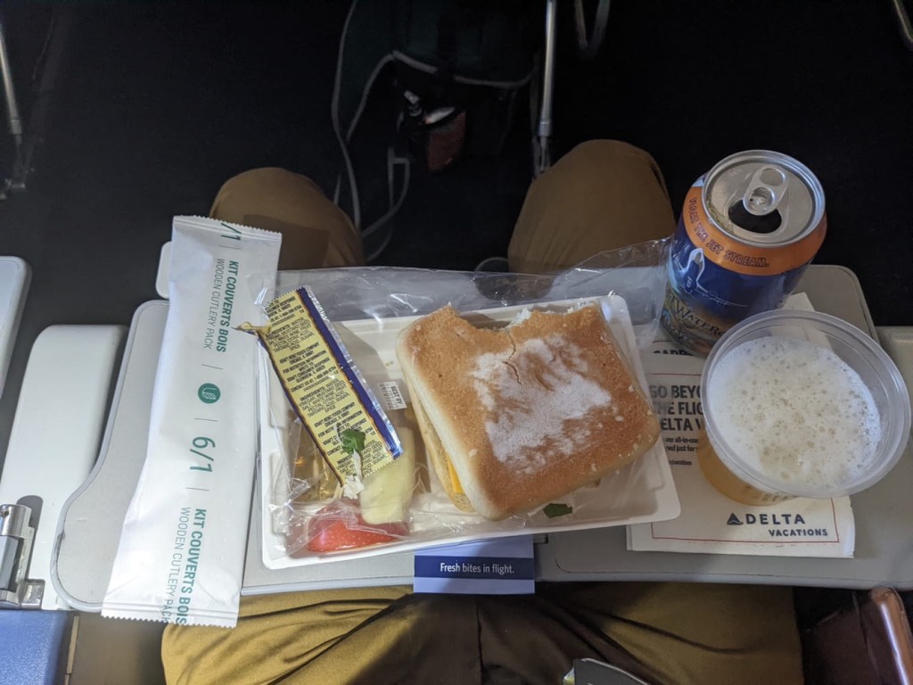 After 20 minutes of watching the gate agent complete our checkin and verify our documents, we were given seats in the exit row. There are certainly worse seats one could have. With as stingy as airlines have become, we were slightly surprised to get a meal onboard. It was, however, a fairly underwhelming turkey sandwich which barely fit on our tiny exit-row tray table.
