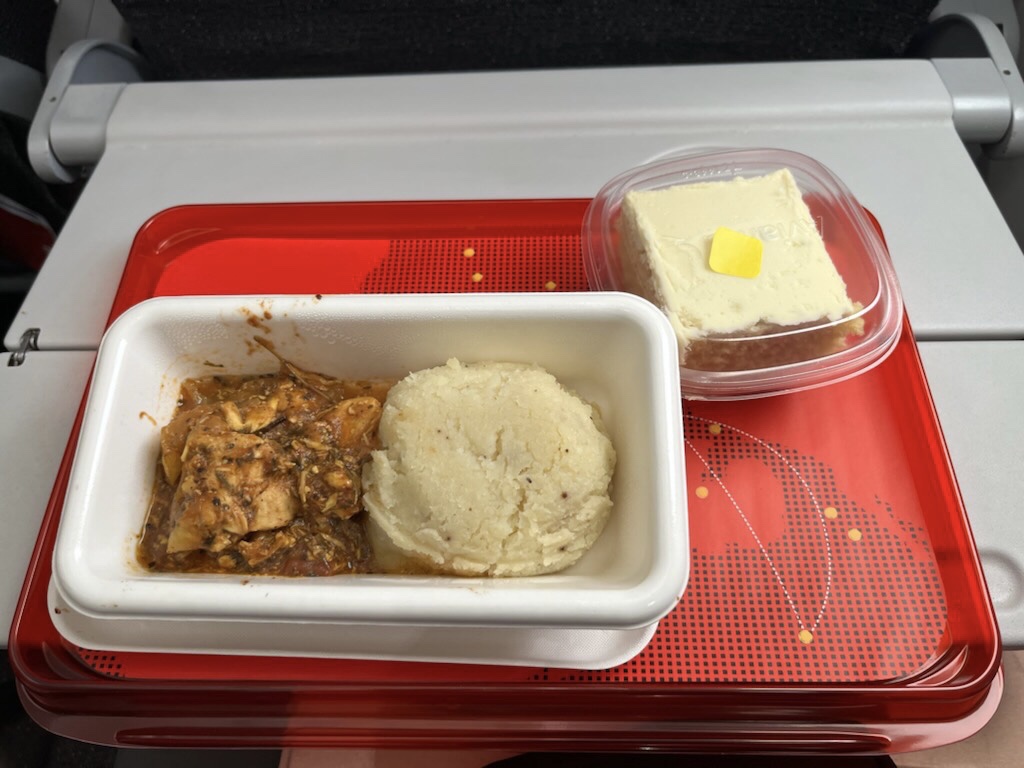 There were no options for lunch — just whatever they slapped down on our trays. It appeared to be some sort of beef and/or chicken with maize-meal and/or potatoes with a sponge cake. Nicole was not a fan. I knocked my seat mate’s cake on the ground by accident. I apologized, but she was so loopy on what appeared to be a cocktail of alcohol and Xanax that I’m not sure she even noticed.