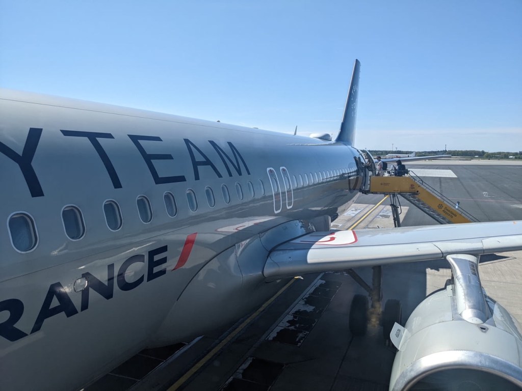 We took an Uber to the airport a little after 10 am. We arrived a little over 30 minutes later. We were informed our flight was “very full,” and thus were not assigned seats until last minute. We did some tchotchke shopping while we waited for boarding to commence. I acquired a Swedish football jersey. The flight was indeed quite full. We were placed in row 4 and 5. Now, the complicated thing with this is that row 4 was technically in what Air France inexplicably calls “first class.” To clarify, there is absolutely zero difference in the size of the seat, legroom, or otherwise. This is fairly common for short-haul European flights. They will simply block off the middle seat for the first few rows and say, “Voila!, such better service!”