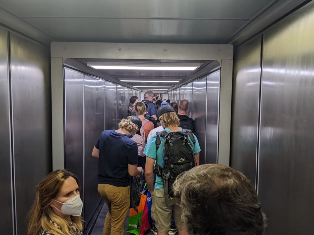 We arrived at a chaotic terminal with poor signage and nonexistent organization. Check in counters are reached by zig zagging around the airport, which has low ceilings and poor aesthetics. Nicole stated that she felt like she was in Port Authority in New York (not a desirable comparison under any circumstances). We were shuffled around a few different lines after being sent to one where no one was working. After finally checking in, we went through security which wasn’t terrible, but reaching it required lots of zig-zagging again. The whole airport is very badly designed. There is not a lot of open space, so everyone just kind of runs into each other.