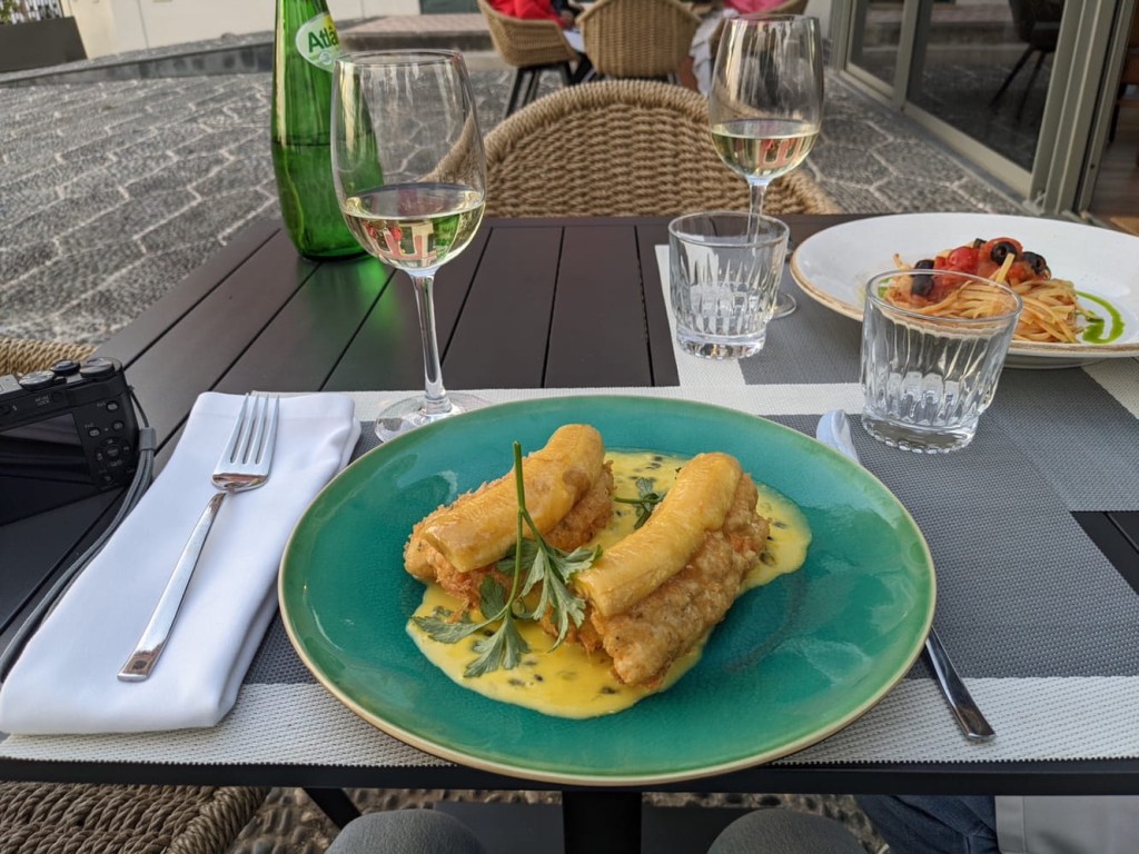 It was now getting close to time to get back for our early dinner (745pm). I ordered peixe-espada preto com banana, which is a very local dish of black scabbard fish with fried banana and passion fruit. We also ordered a bottle of wine for ourselves. The price at 12 euro seemed quite reasonable. We were shown the bottle and offered a taste like the sophisticated celebrity couple that we are.