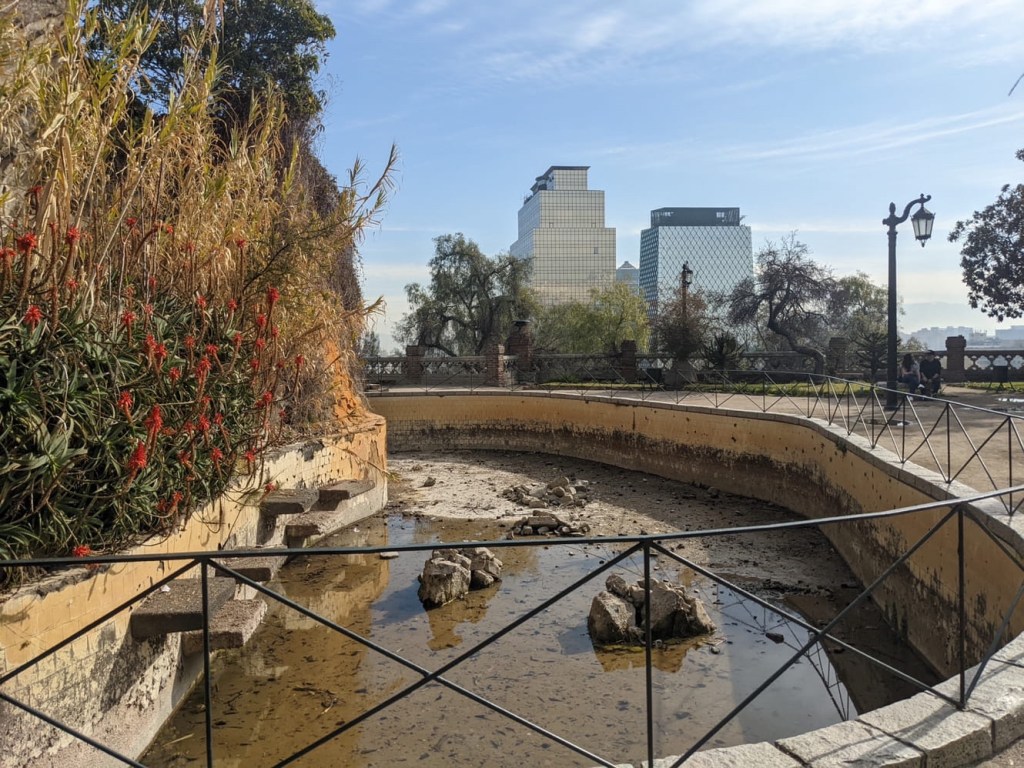 We rode it about four stops to a neighborhood near Cerro Santa Lucía. I had read that the park areas around Santa Lucia hill offered some good views of the city. Up to that point, we had seen typical big city stuff — graffiti, homelessness, gritty architecture, and A LOT of people walking briskly on the sidewalks. It was like being in Manhattan. The mask rules are still fairly strict here, and are required when riding metro or when inside any shops, so it is more common to see someone walking outside wearing a mask than not. The weather itself is extremely confusing. It was in the low 30s when we landed early this morning, but it was now close to 70. In the shade, we were shivering, but sweating in the sun. Almost everyone else committed to wearing a puffy jacket at all times, whereas we kept changing in and out of jackets and outer layers.