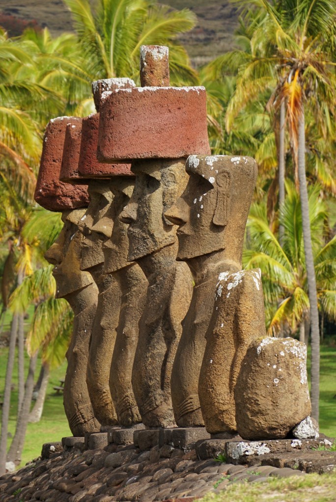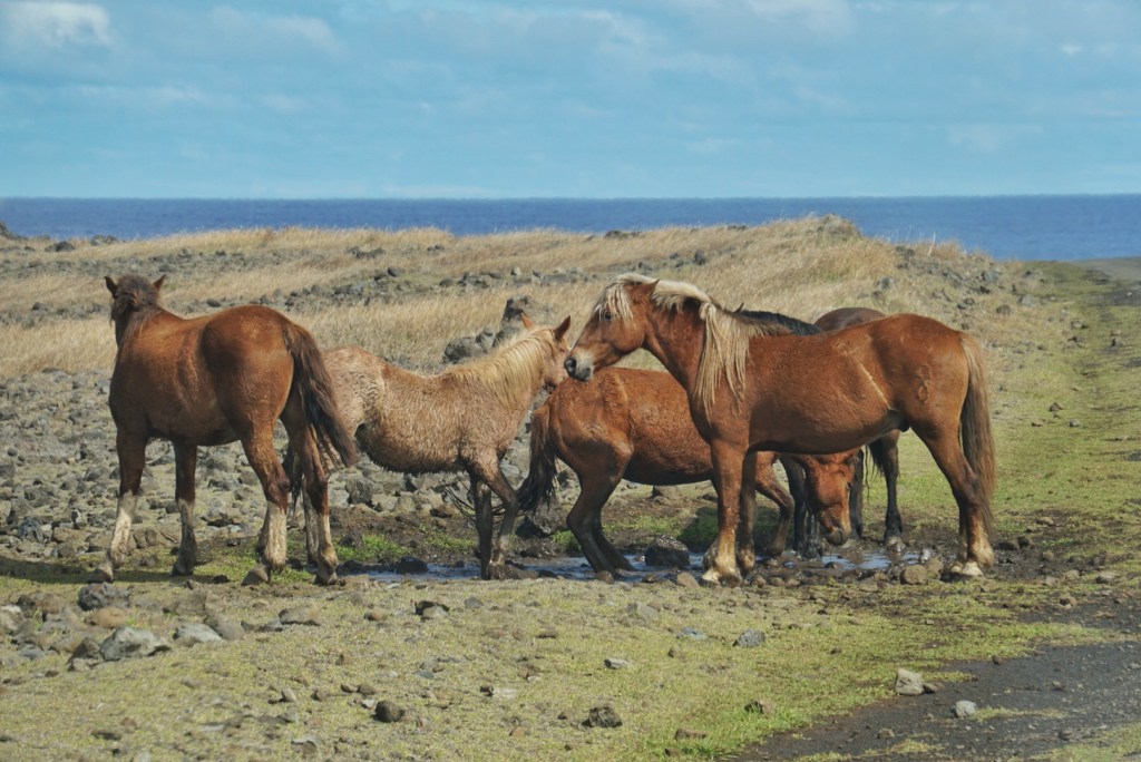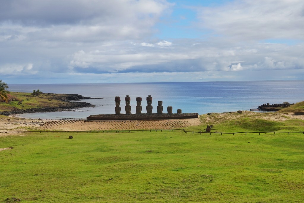 After a light breakfast during a light rain, we got back in the Jimny and puttered off to Anakena beach. It is in the far northeast corner of the island, and we thought that we could perhaps avoid people by doing a reverse route from what the tour companies might do. Based on the crowds there, or lack thereof, our theory was successful.