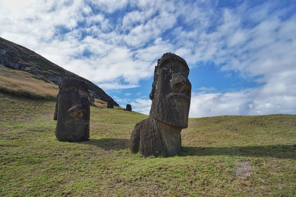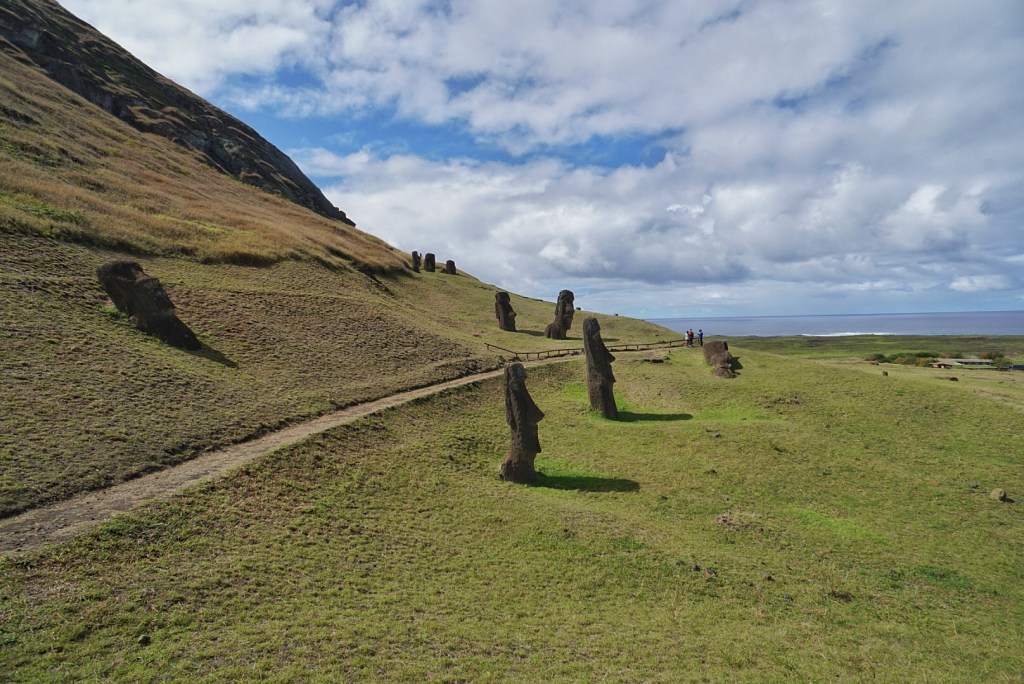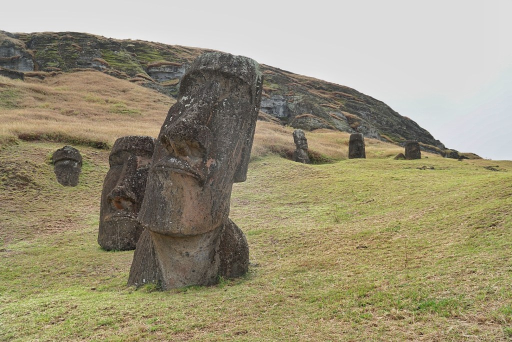 From the beach, we drove inland to Rano Raraku, where the moai were created before making their way to the coast. It was raining fairly heavily when we arrived, so we elected to wait it out inside the Jimny. The humidity increased quite a bit as a result of the rain. It seemed to stop just as suddenly as it began. Everyone immediately seemed to materialize and begin their trek along the trail. We tried to stagger ourselves a bit behind to avoid the crowds, though there weren’t even really that many to begin with. There were no more than twenty people at what is perhaps the most popular sight on the island.