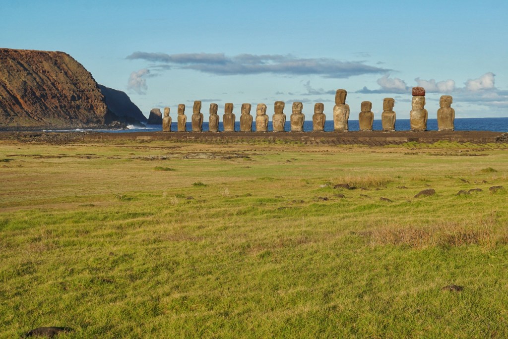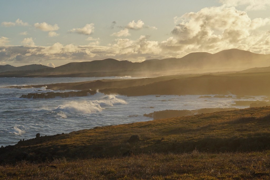 We did some shopping and then spent about 90 mins fighting with a nonexistent internet connection at our hotel. The cell and internet service on this island as a whole is pretty bad. I wisely had maps for the whole island cached on my phone so we wouldn’t be lost every time service dropped out. We elected to drive back toward Ahu Tongariki, or the fifteen moai on the southern coast. There was a particular angle that we just missed out on with good lighting yesterday evening. We had the time and figured why not head on back out. It was only a 25 minute drive, and we arrived just in time to catch the evening sun’s glow on their faces.