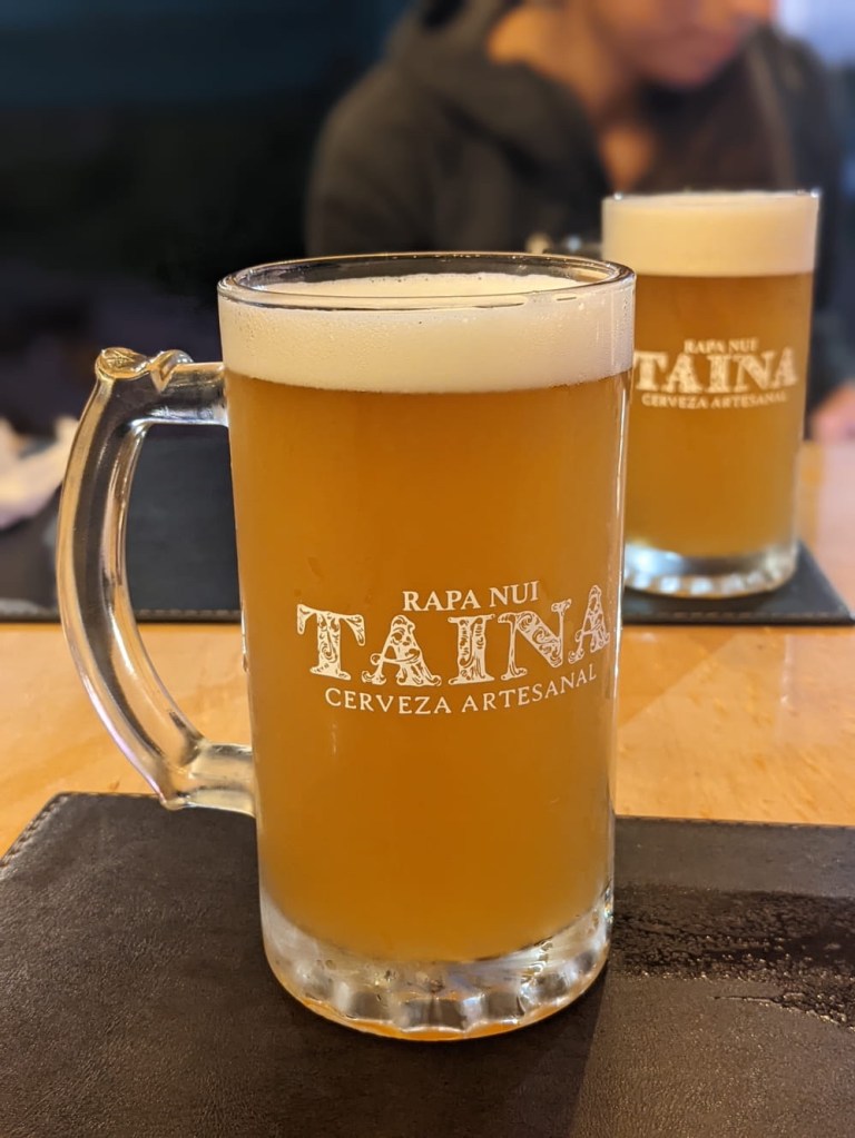 For dinner we went back to the Taina Beer Garden. They had their own beer on tap today, so it must have been aided by the arrival of yesterday’s flight. Nicole thought it tasted too wheat-y, or grainy. I agreed that the ratios were a bit off. That’s the charm of island microbrews. We got some merchandise before leaving — including two mugs to add to our collection. Souvenirs—check. Tomorrow we will likely be in Buenos Aires, but have no hotel and the internet hasn’t allowed me to check-in for that connecting flight, so perhaps we will end up back in Santiago. Only time and the wifi capability will tell.