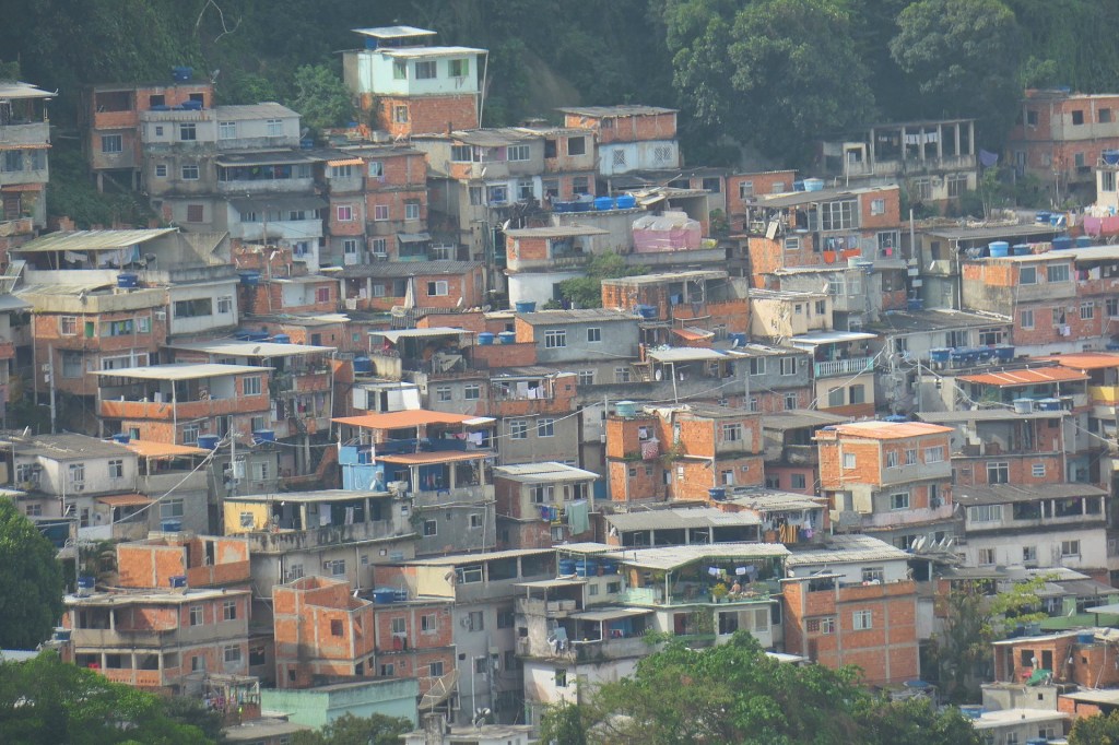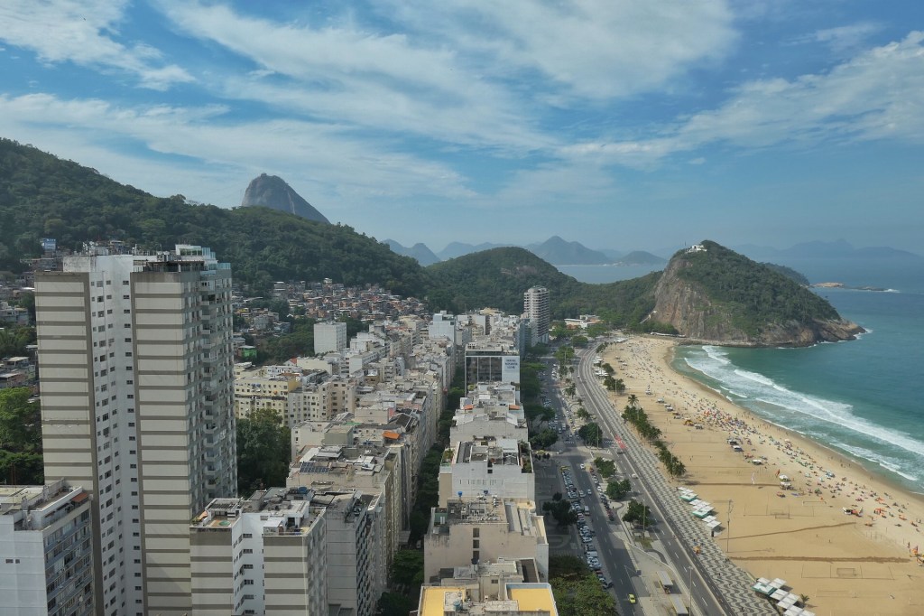 The rooftop offered good views in the direction of Pão Açúcar (Sugarloaf Mountain). Riding gondolas to the top of the hill is a popular tourist activity for the area, but Nicole and I didn’t see any appeal to this. After all, I think it is the hill itself that is photogenic and it is quite difficult to see it, if you are on it. Also of interest is the rapid progression of beachfront high rises to apartments in tight quarters just a block or two back, followed by working-class multi family dwellings crammed into the hill-side just beyond. In the past, these neighborhoods would have been called “favelas,” but that term is becoming a bit controversial as it has a very charged connotation of crime and inferior status.