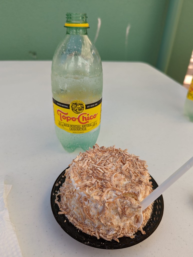 After parking on the street, we walked around under the hot sun. There were some shops open, but the bakery we were hoping to visit was closed on Wednesdays. Does our bad luck ever end? Obviously we will be back tomorrow. In the meantime, I struck a compromise by getting a tres leches coconut cake at a different panadería.