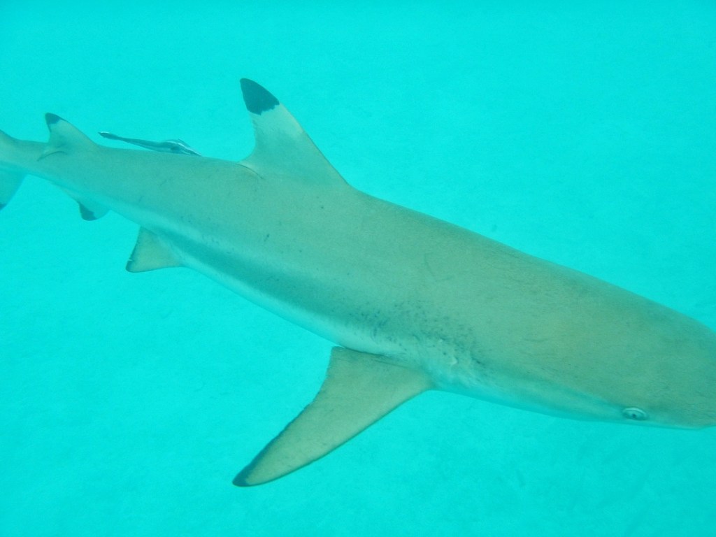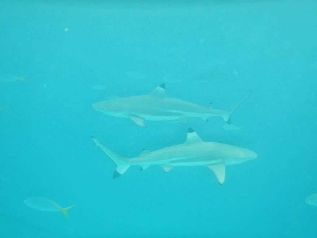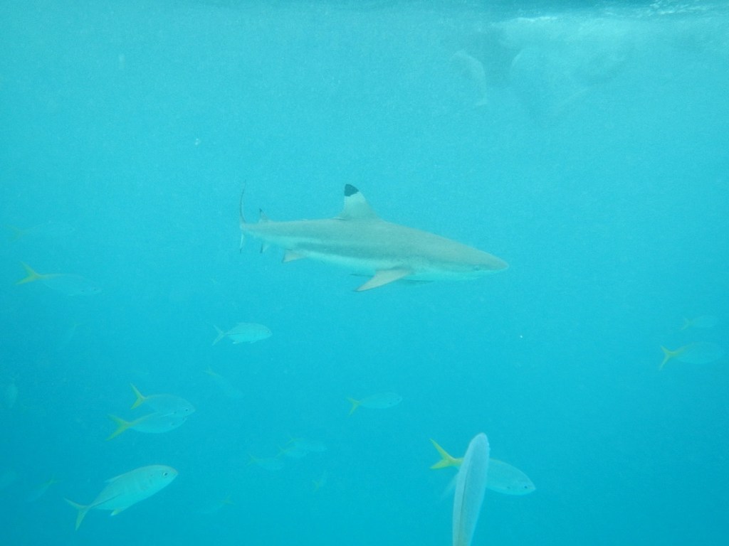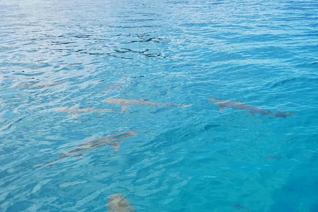 We had one more stop at the appropriately-named “Shark City.” It is a popular meeting spot for the sharks — particularly black-tipped reef sharks as you see above. I think everyone was of the assumption that we just pulled up there to observe them from above, but the guide kept looking at me and saying, “Ok, jump!”