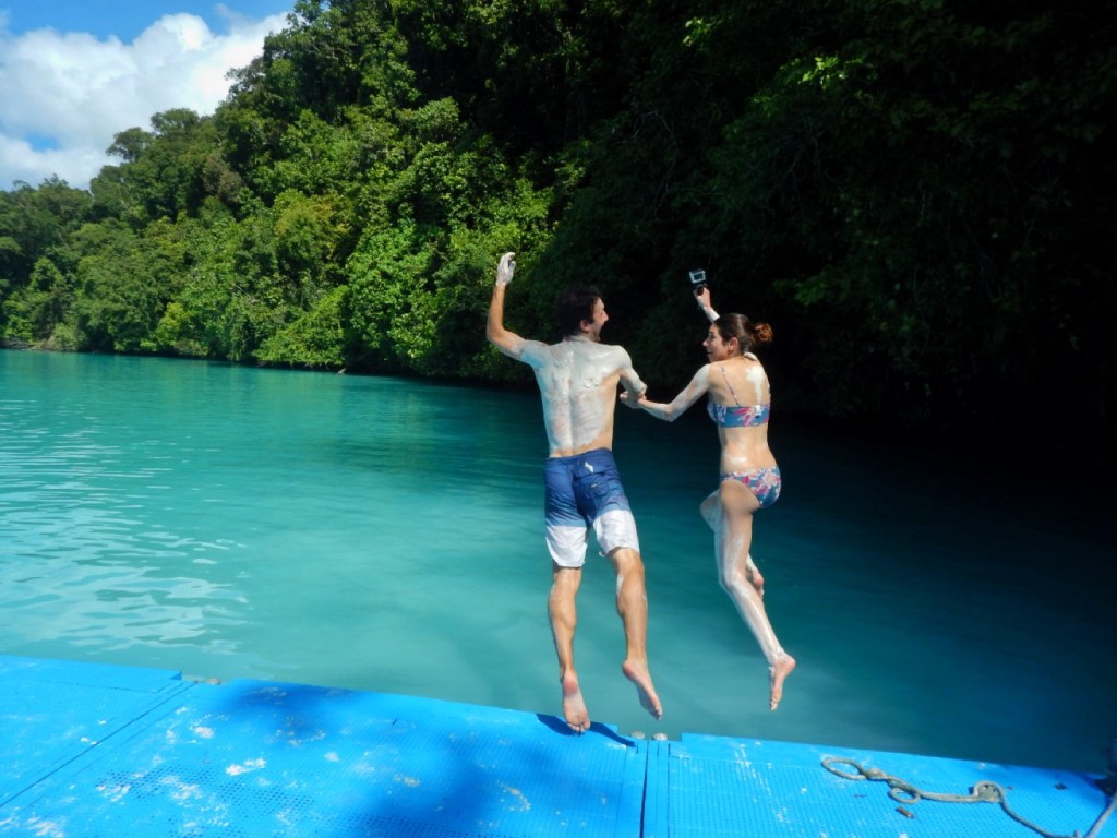 The Milky Way is a semi-insulated body of water with lots of limestone-enriched muddy waters. Nicole and I applied said “mud” sporadically to our bodies. Our pilot yesterday said it smells like mayonnaise and I was highly skeptical of this statement, but wow was he accurate. It was a bit pungent. Our guide took a picture of us jumping into the water to cleanse the mayonnaise from our bodies.