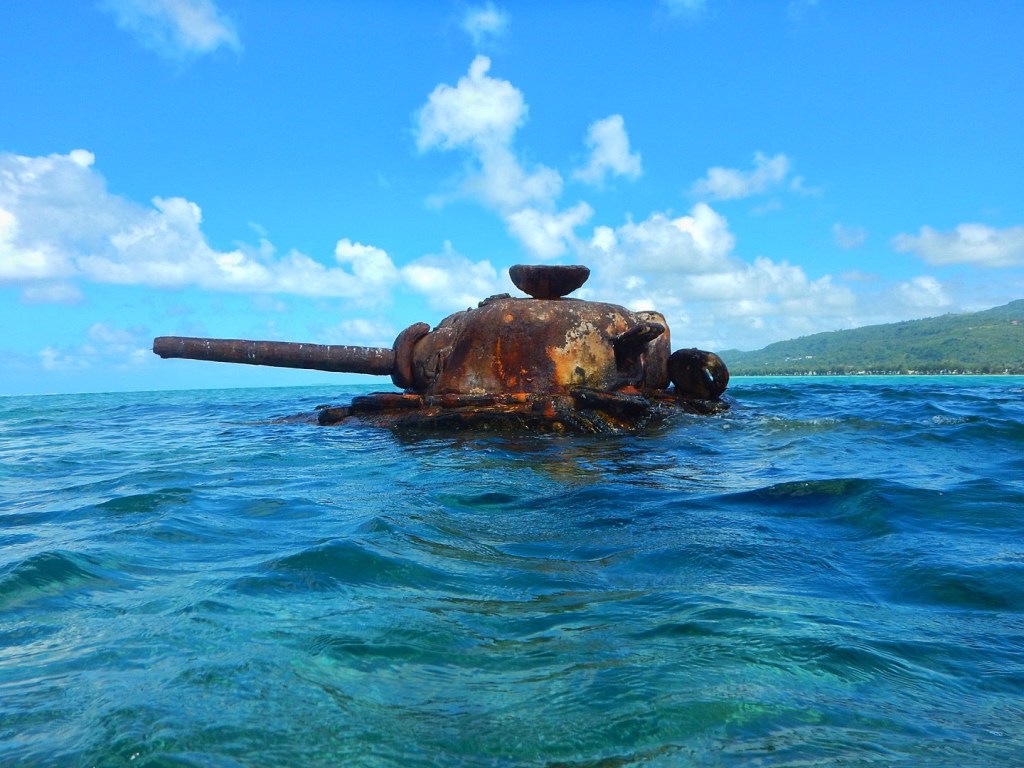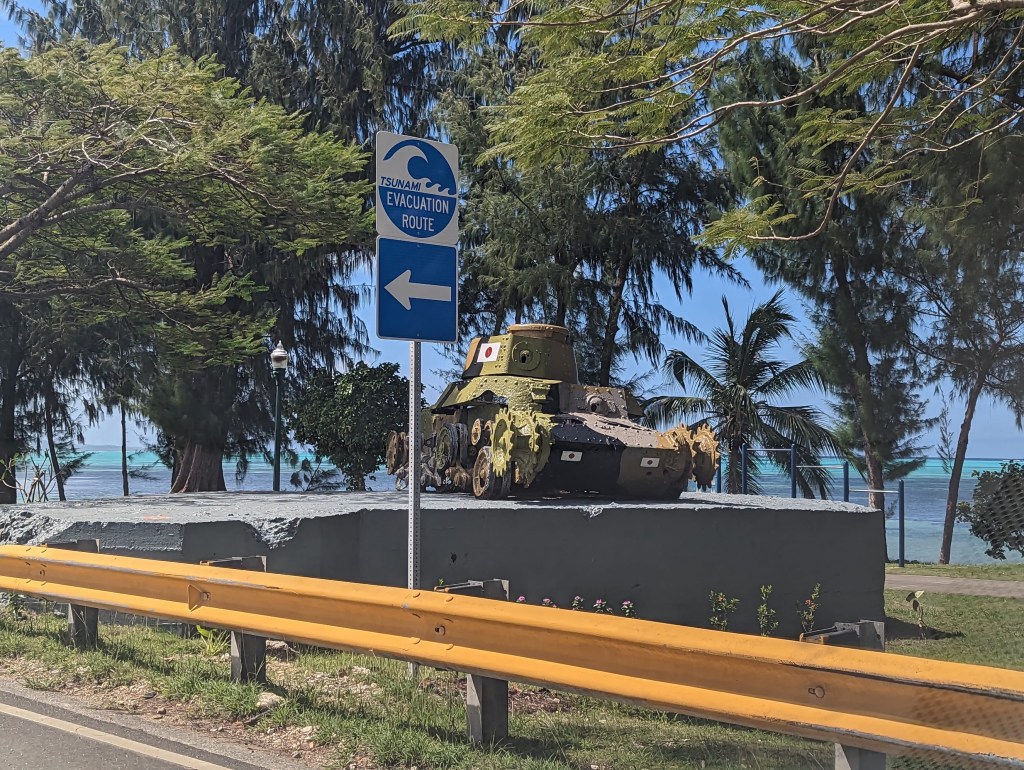 Then we drove a bit south along the coast to the the beaches where the Americans did the bulk of their amphibious landings. While under Japanese artillery fire, some of the landing craft carrying the American tanks were hit. The American Sherman tanks, as it turns out, didn’t do great when half-submerged under water. They either ran aground, bogged down, or slogged along so slowly, they became easy targets for further Japanese artillery strikes.