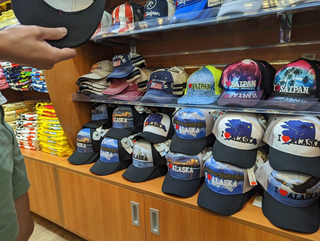 Bricole, everyone’s favorite celebrity couple, returned to the hotel to recover from our ambitious tank swimming and did a bit of souvenir shopping at a nearby ABC store (the same ABC store that is ubiquitous in Hawai’i) and also a store simply called, “I ❤ Saipan.” As Saipan is essentially the closest U.S. soil to Asia, the souvenir shops have tapped into this by selling all kinds of things that had very little to do with Saipan, but a lot to do with stereotypical America. Dreamcatchers? Check. Denim vests? Check. Trump magnets? Check. A large variety of hats saying “I love Alaska”? . . .Um. Check.