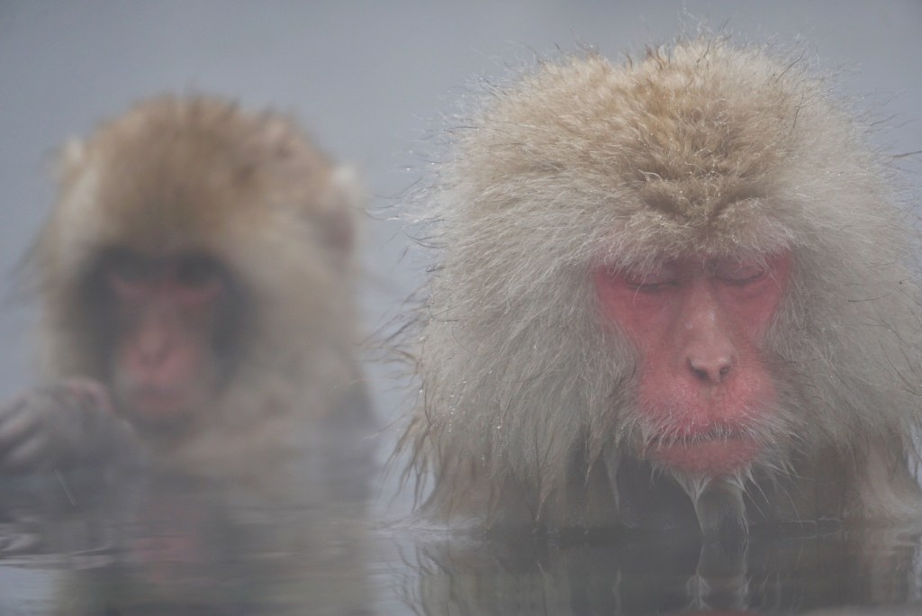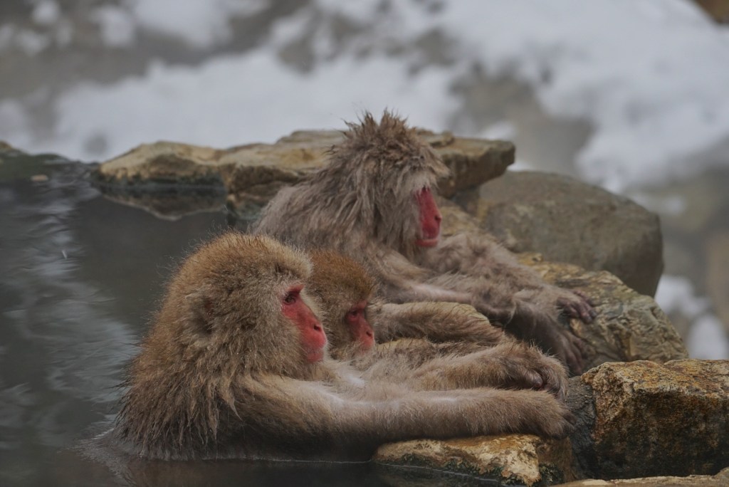 The natural hot springs or onsens are commonplace in this area, but seeing humans in them seems to have inspired the monkeys to follow suit. Looking at them and their poses, it does seem oddly “human” the way they soak in their new environment.