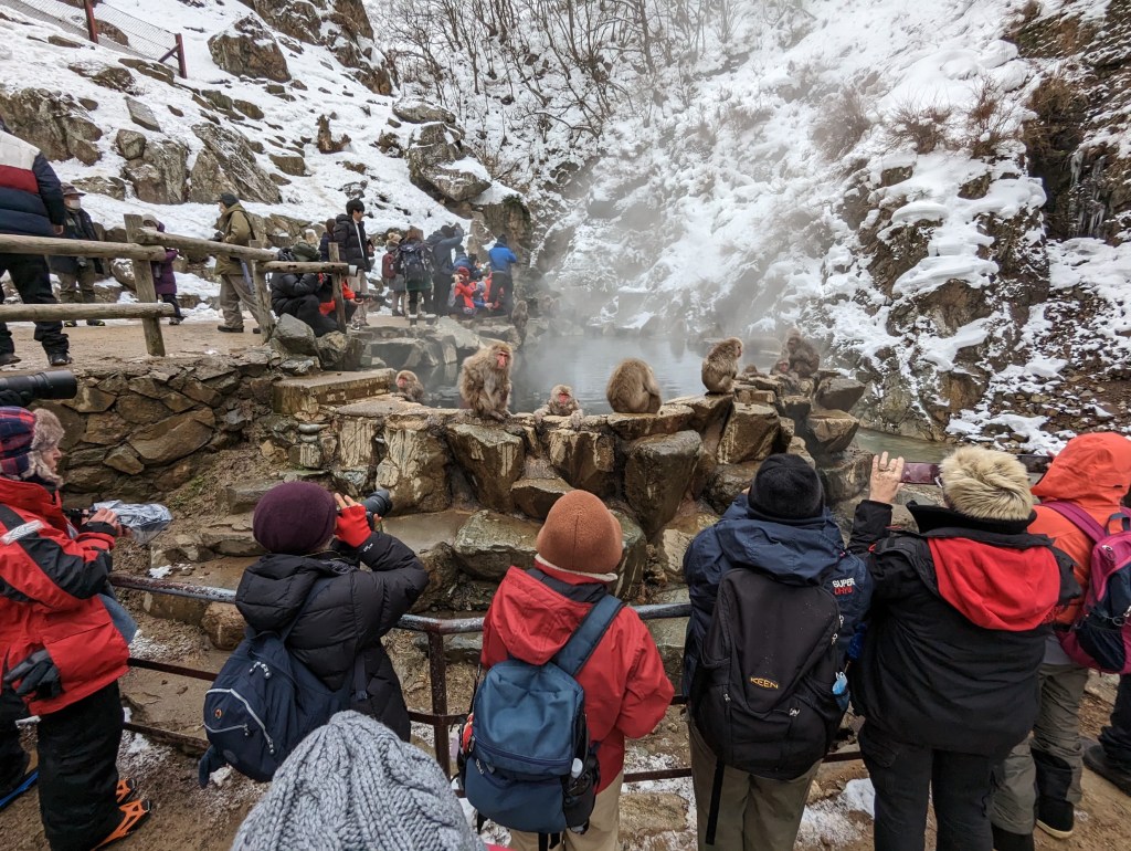The entrance to the monkey park was an additional 2-3km from the bus stop on an icy/snowy pathway. We were using our covid masks to keep warm as snow continued to fall. The actual story behind the monkey park/onsen is perhaps slightly underwhelming. The snow monkeys would not have normally had a natural instinct to track down onsens as it turns out. As ski resorts and other development occurred in the region, the monkeys found themselves searching for a new habitat, which led them to raid farmers fields. This did not go over well with the farmers, who wanted to hunt them. A conservationist created a swathe of land and enticed the monkeys to enter the protected zone by repeatedly putting apples out. Creatures of habit, and following their stomachs, they came to the area now known as Jugokudani Monkey Park.