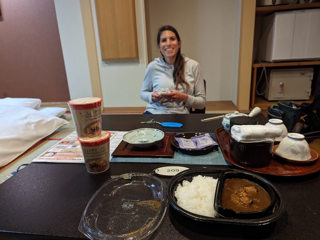 Our room rate did not include the elaborate ryokan dinner, so we made another trip to Lawson’s to fill the void. Beef curry and rice with some cup ramen, and a chocolate eclair completed the feast. After dinner, we relaxed for a bit before preparing for the onsen. It seemed logical to me that we should put on our yukata (kimonos) for easy access in and out of the onsen. I collected the key from the lobby and we headed up to our private onsen outside on the roof. Typically there is a public bath for men and one for women, but this unique situation allowed us both to go in. We wore our bathing suits, though the public ones are more often nude.