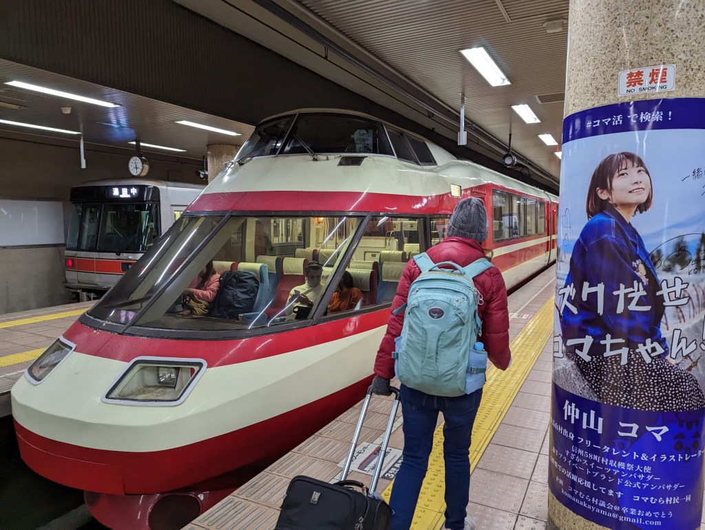 Nagano was the site of the 1998 Winter Olympic Games, so it seems reasonable that this region would be snowing more heavily. The train from Tokyo to Nagano took about an hour and a half. According to my google directions, we had just a twelve minute transfer time in Nagano. Since it was a different train company, we had to buy new tickets. I mistakenly went into the JR office for tickets (wrong company), but was helped along to the proper spot. The gentleman working tickets for the next leg of the line appeared from a small door behind the ticket kiosks like the Wizard of Oz. He entered the proper numbers into the machine and we promptly paid and boarded the next train with a few minutes to spare. It all went surprisingly smoothly, thanks to the help of the always accommodating and helpful Japanese workers.