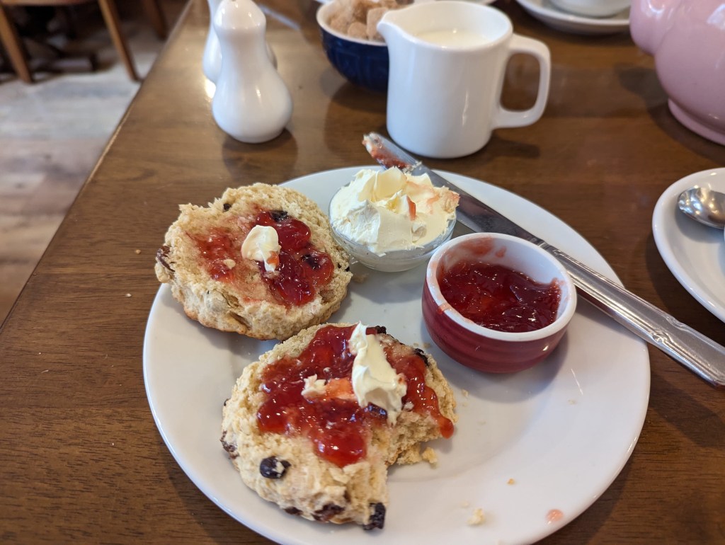 We walked around the town center for a while after being turned away from a couple tea rooms because they were at capacity. Afternoon tea is after all a rather big deal here. We didn’t want anything elaborate like we had in Madeira, and we eventually found a fairly casual place called “In the Mood,” where we ordered cream tea. Cream tea is not actually creamy tea, but refers to an order of tea along with a scone that is often accompanied with jam and clotted cream. We were hoping to charge ourselves with some caffeine. It seemed to have little to no effect.