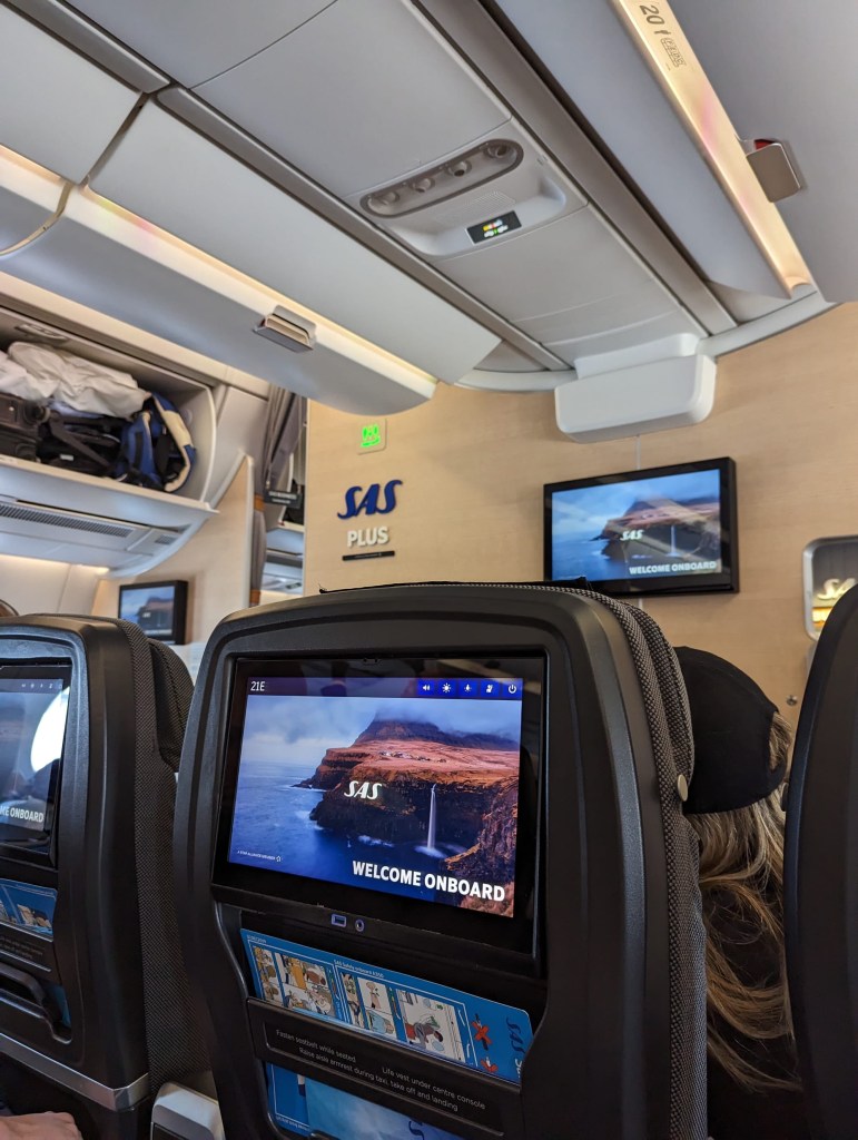 We completed our checkin at Kastrup airport and went through security, which was much more efficient, friendly, and cleaner than Manchester. We then waited to see what seats we would get. Last night I had multiple dreams about sitting in economy seats, so perhaps my mind was trying to mentally prepare me for the inevitable. There was one remaining business class seat, which I offered to Nicole, but the gate agent took slight issue with Nicole’s wardrobe which included *gasp* jeans. It is technically written into SAS’s dress code requirements for business class standbys, but I didn’t think they would actually enforce it as long as you looked clean and inoffensive. It’s not the greatest policy for people who don’t even know if they’re getting on a flight (and typically pack lighter) to also have to go out of their way to carry an extra wardrobe (including dressier shoes mind you). Either way, we declined the one business class seat, and the gate agent was actually pretty nice and rearranged a passenger to another aisle seat in a different row so we could sit together in SAS Plus (a sort of premium economy seat) with extra legroom.