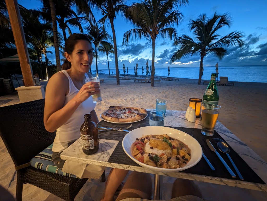 We watched the sun dip lower on the horizon from our large balcony before going down to dinner. Unlike the Conrad properties we stayed at on Bora Bora or the Maldives, we are not a captive audience and have options to eat elsewhere on the island. Thus, the prices at the hotel’s own restaurants were actually reasonable. I had a Caribbean red chicken curry and Nicole had an eggplant pizza. We washed our food down with a couple of Red Stripes.