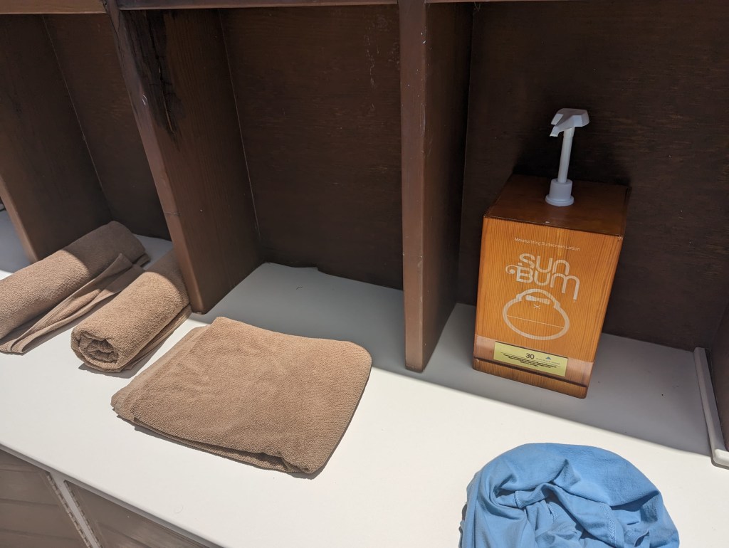 We had a late lunch that involved reheating the leftovers of Nicole’s pizza from last night. So far today, $0 has been spent on food. Good for us! Some nice touches that I have found around the LXR, are the presence of bottled water stations and sunscreen dispensers around the pool and beach areas. I found it a rather thoughtful addition that goes in contrast to the practices of say — the Conrad Maldives which charged $50 for a small tube of sunscreen.