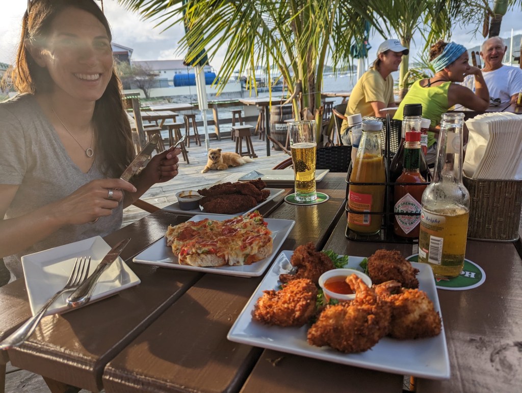 We went across the street to the Sint Maarten Yacht Club for dinner. We were there during happy hour. Their special was any three appetizers for $30. We got some coconut shrimp, a pizza, and chicken fingers. It was more than ample. It was clear we were on the Dutch side because all the beers were mediocre Dutch brands like Amstel or Heineken. I suppose anything tasted fine after sweating through all of our clothes on this rather hectic day. It was a decidedly older crowd of what appeared to be locals and expats. Everyone seemed to know each other.