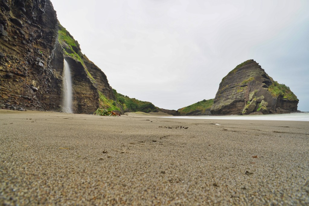 There were some nice prominent rocky hills jutting out at the edge of the water. Naturally, there was also a waterfall to check out nearby. I suppose there has been ample rain to keep it gushing for some time. Surprisingly, despite the rather chilly and wet weather, there were many surfers in the water. One plus of being here in such ghastly weather is that we were virtually the only ones on the beach.