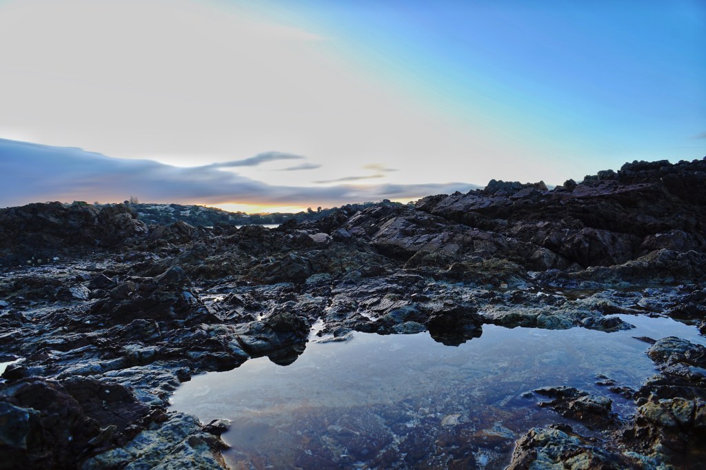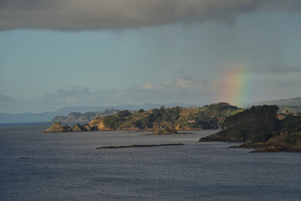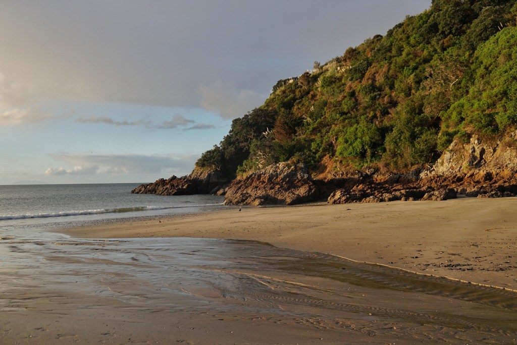The Air BnB we had booked was very serious about its check-in time of 2:00pm, so we had to kill a bit of time. After picking up our rental car, we drove around the area a bit — making a stop at Little Oneroa Beach. Oneroa means “long beach” in the native Maori language, which makes Little Oneroa Beach translate to Little long beach. There was a small path (or as they call them here …“tramping tracks”) that led up the nearby hillside for some views overlooking the little long beach.