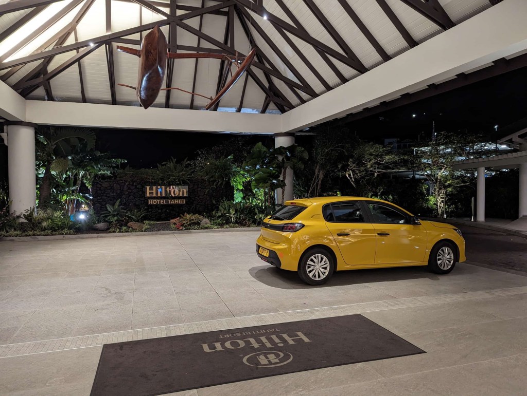 Customs and baggage collection went surprisingly smooth. I then acquired a rental car — a bright yellow Peugeot 208 which shockingly fit all of our bags (and us). We then rolled up to the Hilton Tahiti like a clown car — each of us tumbling out unceremoniously into the open-air lobby of the upscale hotel. Nicole, who is a Hilton Honors Diamond member, got both rooms upgraded to an ocean view.