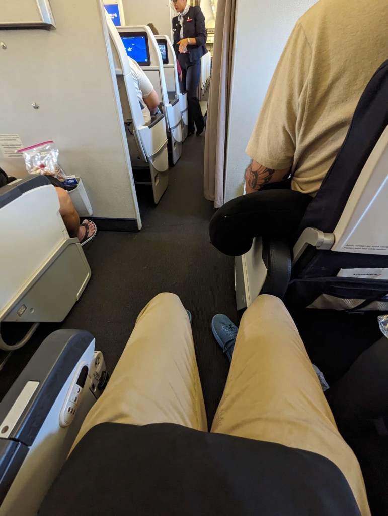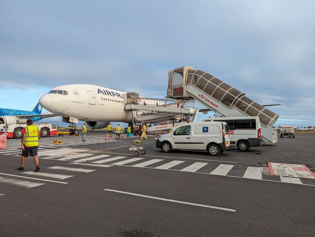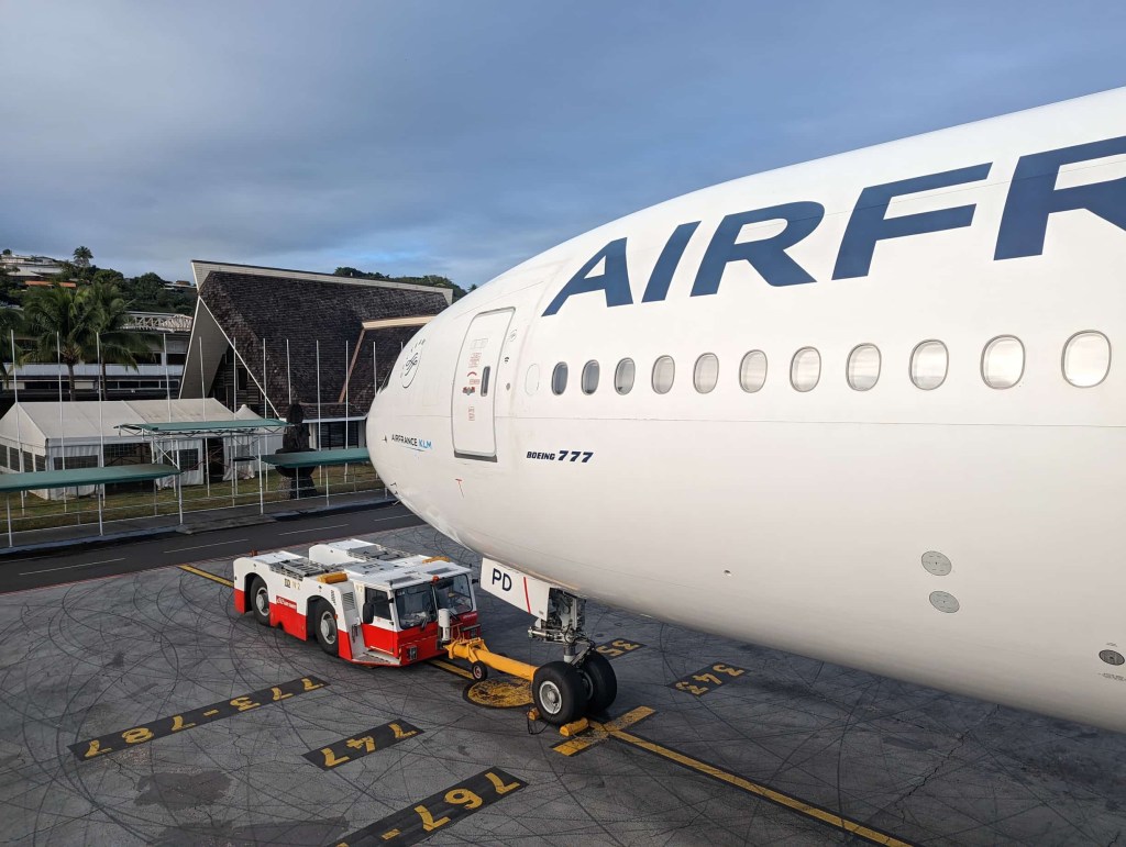 It was an early wake up to make our way to Fa’a’a International Airport. Checkout took some time at the Hilton, as they are perpetually understaffed. The rental car return was also a bit ambiguous, but eventually sorted. We both had to check our bags even though the limit was 12kg. When Nicole put hers up on the scale and it weighed 11.8kg, she questioned as to why she had to check in. They didn’t really have an answer. Security was as inefficient as we remember it. And yet, despite all the setbacks, Air France gave us fairly decent seats just behind the business class cabin. While my unique seating arrangement gave me some extra legroom, i did feel a bit out in the open like I was on display.