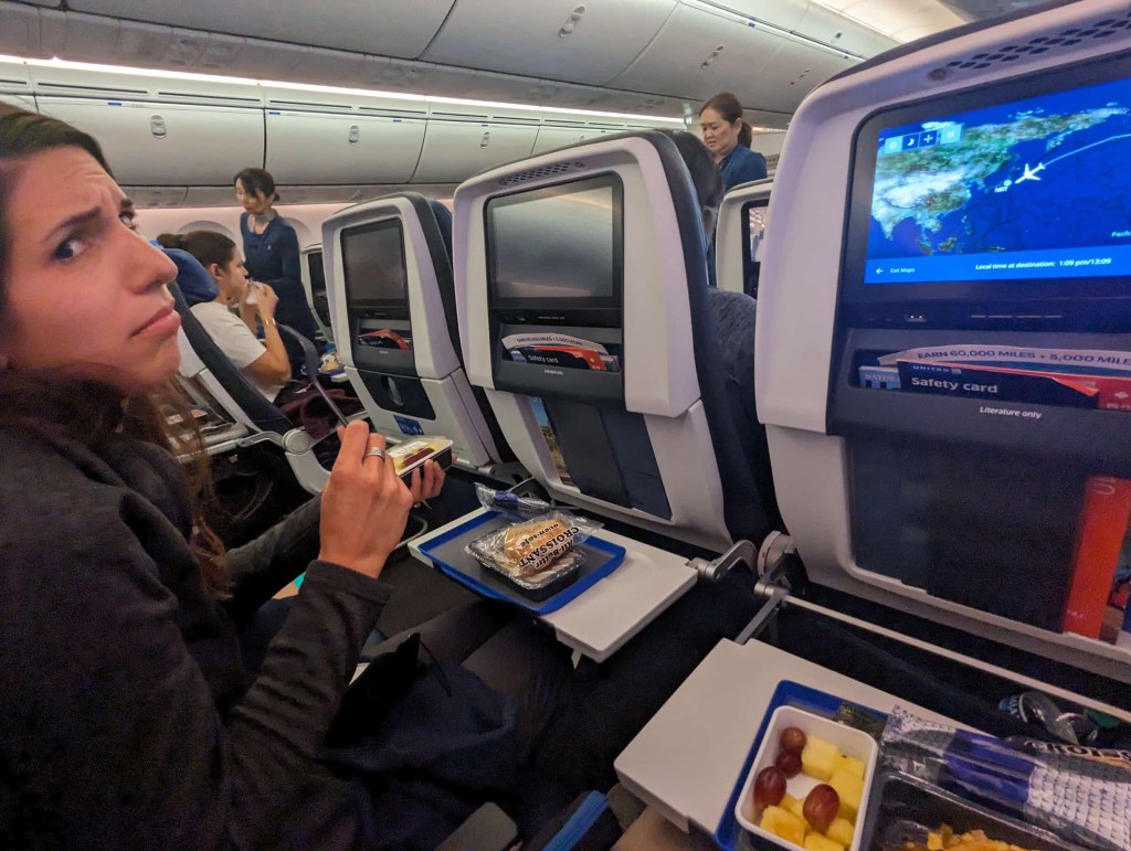 So here we are in seats 34 K & L on our way from LAX to Tokyo Narita. There was a slight chance we could have gotten business which quickly degraded to only one of us possibly getting business (always a difficult decision) to ultimately having no chance after the standbys above us who had already been awarded business seats were then unceremoniously downgraded to economy as well. In a way, it became easier to accept our fate knowing that it wasn’t that close. United served its usual mediocre food such as strange waffles and eggs for a “breakfast” as we approached Tokyo to land around 3pm.