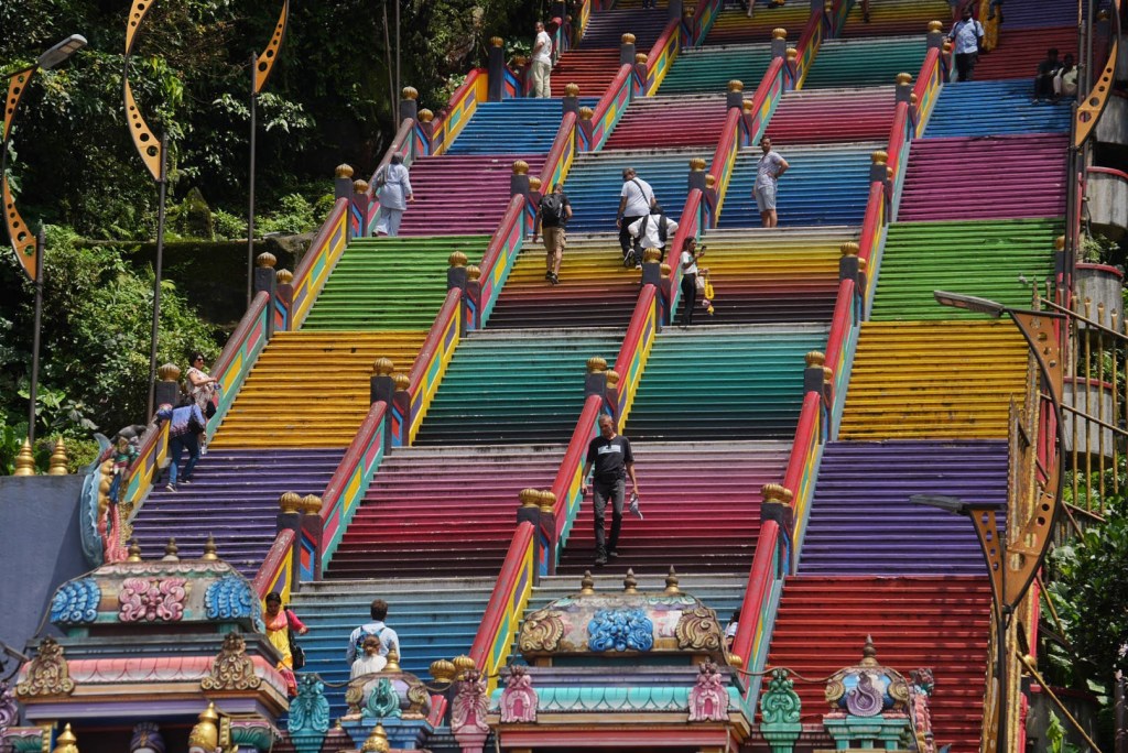According to wikipedia, there are 272 steps to the top. I’m not sure whether or not this includes the steps that ultimately lead down into a cave area and then back up to another temple. The steps weren’t multicolored until 2018. I would argue that it’s a fun improvement over basic concrete grey, but evidently it is somewhat controversial because people struggle with change.