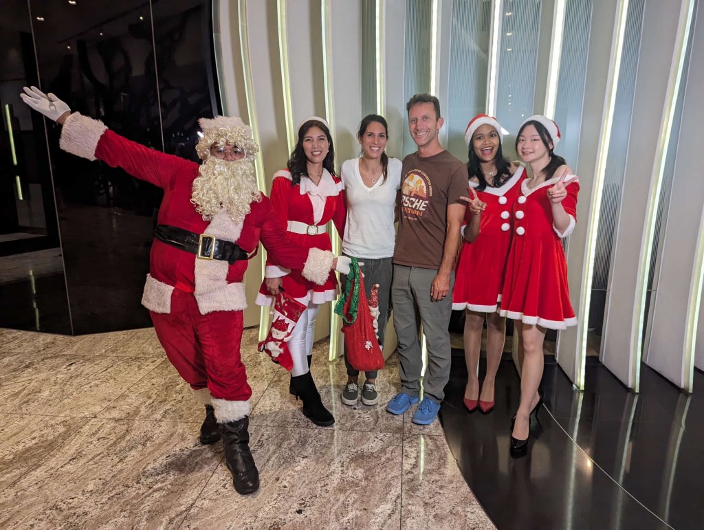 After enjoying some free appetizers and wine back at the executive lounge, a downpour commenced and we ventured to the lobby for food. They had an a la carte menu that had options for all palettes. I had Nyonya chicken rice with red chili sauce. Nicole had a margherita pizza. None of this was all that out of the ordinary. However, when we first came out of the elevator to the lobby, there was an entire choir and band playing Christmas tunes while workers were dressed up as Santa and other Christmas creatures. We must have looked bewildered, so a manager of sorts came over to attempt to explain what was happening. As he stated, “We may have started a bit early this year.” There was some kind of event involving media etc. to kickoff the holiday season as it were.