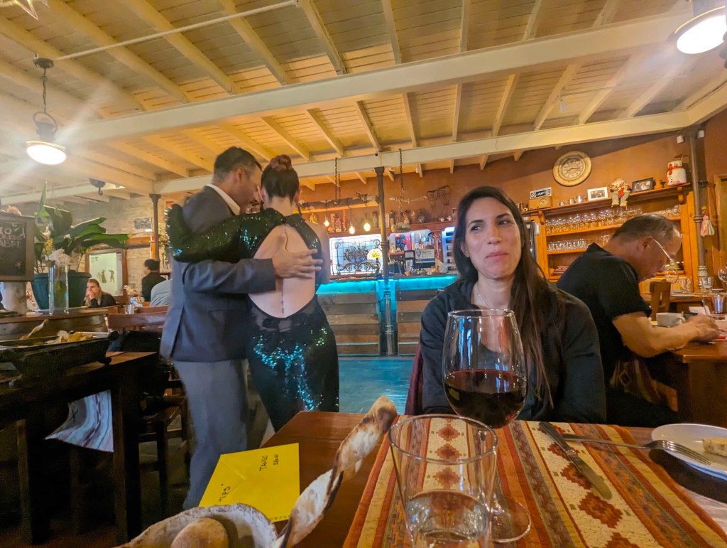 After returning to the hotel, we walked to a place called Mi Rancho for dinner. It came highly reviewed, but Nicole’s empanada appetizer appeared to simply be frozen and reheated as it had a bit of ice. The rest of the food was decent, and we even got a spontaneous tango show. I had a massive slab of Argentinian meat. They don’t do small portions of meat in this country — I think it’s a matter of pride.