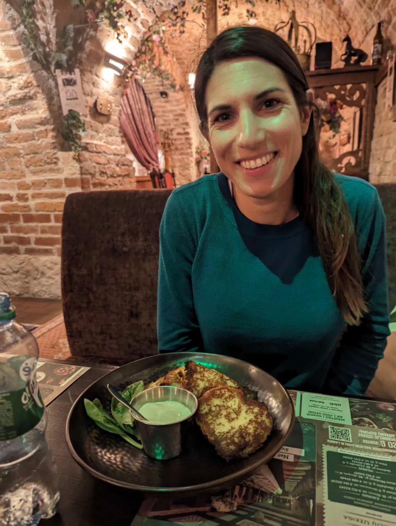 And on that note, Nicole was researching Lithuanian foods and discovered that the weird bread concoction she had yesterday is a Lithuanian staple (and also poorly translated). Unbeknownst to her, but knownst to Lithuanians, Nicole keeps inadvertently ordering everything that Lithuanians hold dear. So it seemed logical to take Nicole out to another Lithuanian restaurant. We took a short walk around the corner from our hotel into some sort of cave-like restaurant specializing in Lithuanian cuisine. I had a pork fillet with some kind of overpowering mushroom sauce with an order of the weird bread stuff on the side. Nicole got some blynai, or potato pancakes. It seemed innocuous enough, but everything is just so heavy, dense, and greasy. I think we are done with Lithuanian food. It comes as little surprise that there are few…or perhaps no Lithuanian restaurants outside Lithuania. The good news is that we are leaving this country tomorrow morning for Latvia. Obviously the food over there must be better.