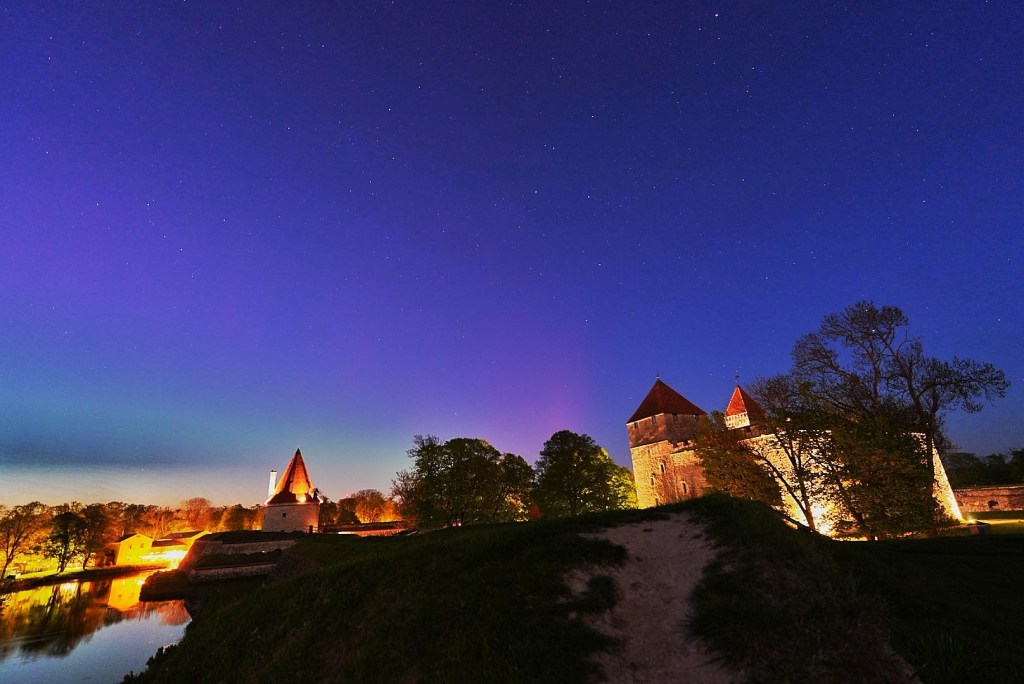 Just as we were about to tuck ourselves in last night, I checked the Aurora forecast on a whim to see if anything was happening. It was showing a KP index of 6 which is moderately high, and it showed our location in a possible band of areas where an aurora sighting might be possible. It was 1230 at night, but I suited up to assess the situation. I figured my only possible option was to scale the ramparts of the nearby castle as it would get me away from most of the lights and give me a little bit of elevation.