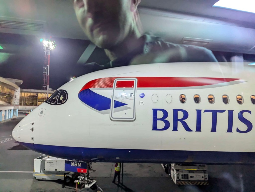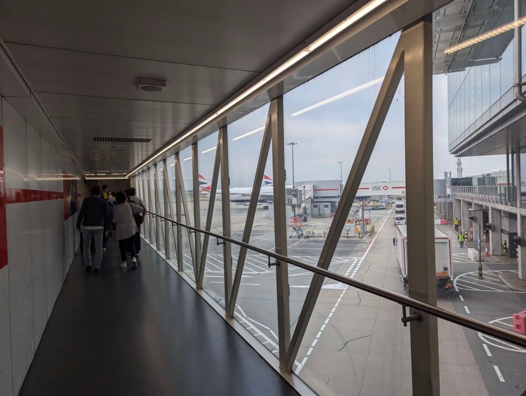 Our flight departed at 9:55 (or was scheduled to in any event). We thought we gave ourselves adequate time even by Heathrow standards, but Heathrow always finds a way to annoy. Despite some traffic, the car drop off worked out ok. I only needed to return it with 80% charge or above to be considered “full,” and I had dropped it off with a respectable 89%. Transit to the terminal was fine, and we even got seats issued upon check-in which we did at a kiosk. The line for security was inefficient and poorly executed. Both of our boarding passes were flagged and we were sent to a separate line to have our visas verified. From the end of the line to the other side of the security checkpoint took almost an hour. Not great.