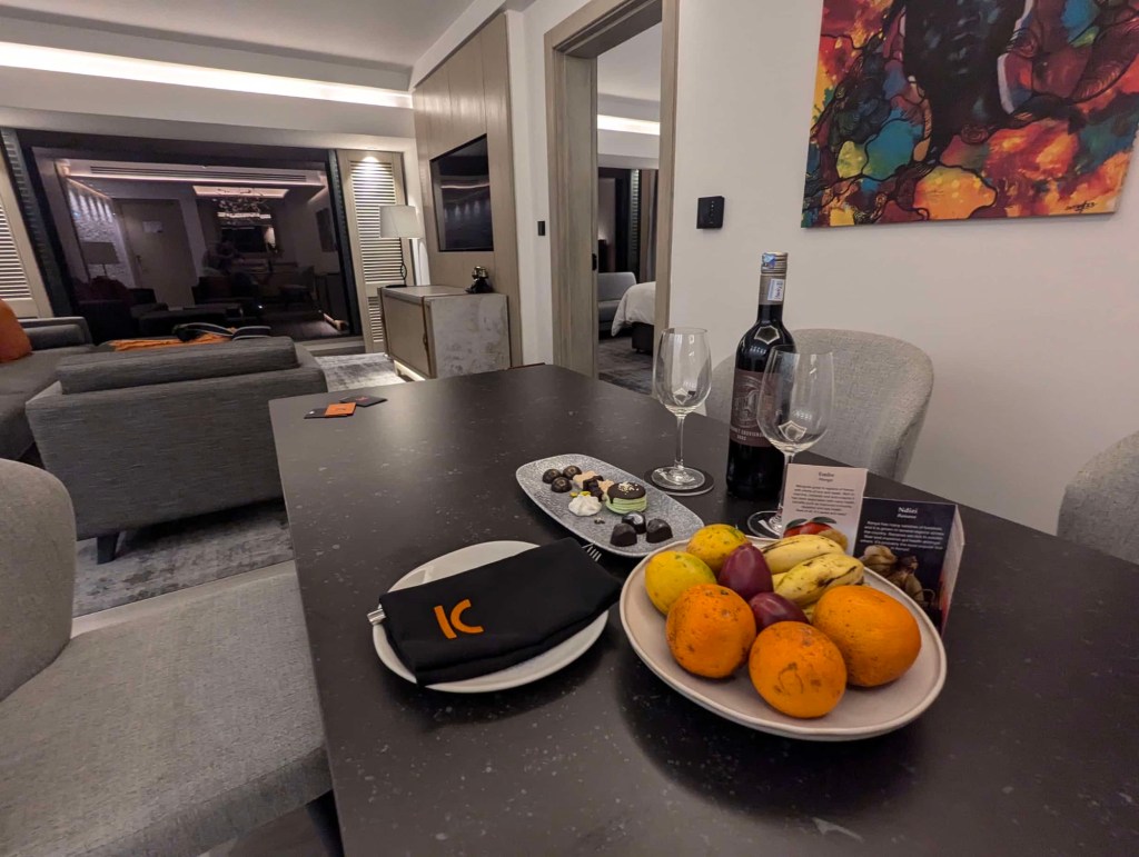 We arrived at the Kwetu Nairobi Curio Collection by Hilton. It was a thirty minute Uber ride and we arrived around 1140pm. We were greeted with a room upgrade to suite and a nice display of treats and South African wine for us to enjoy at some later point, but right now we desperately need some sleep.