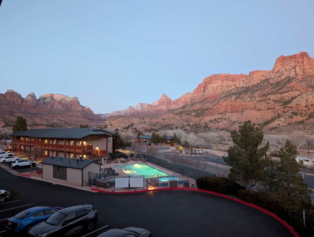 There was one order of business to attend to before we hit the road. We wanted to try our luck at getting hiking permits for Coyote Buttes North aka “The Wave.” These permits require winning a lottery either months in advance, or really rolling the dice on last minute permits. Nicole and I have attempted the advance passes over the years without any success. The last minute lottery closes at 6pm every day and the online application requires that one’s mobile device be within the so-called “geofence,” which is limited to the area between Page, Arizona and Kanab, Utah. The application can somehow sense this based on your phone’s GPS. The St. George airport was more than an hour outside of the geofence. So when we arrived, we wouldn’t have been able to get inside the geofence and submit our application by the deadline. BUT, I was able to do a little GPS trickery and make my phone act like it was in Kanab whilst still in St. George. We submitted the app and headed toward our hotel in Springdale, Utah — the Hotel DeNovo, part of Hilton’s tapestry collection.