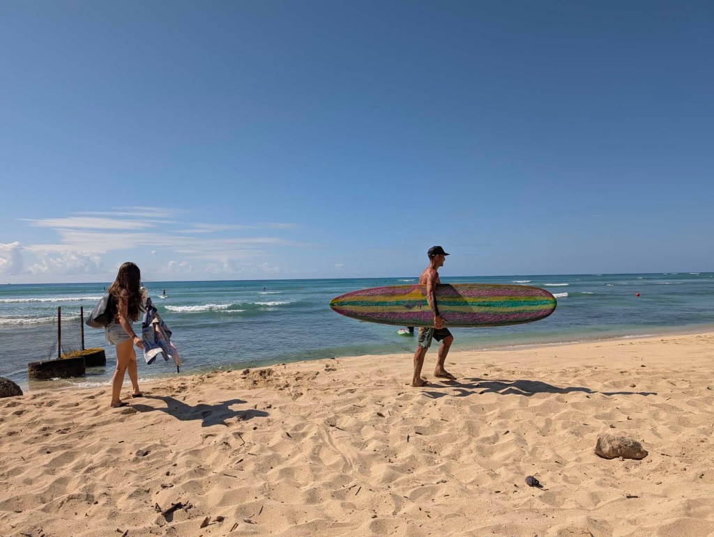 The Hampton Inn breakfast was an absolute menace. Children everywhere. Coughers: everywhere. Food: mediocre. Annoyed by people, we abandoned the breakfast buffet early and set out into the wilderness. We drove to nearby White Plains beach. There were numerous surfers out enjoying the waves whilst Bricole, everyone’s favorite celebrity couple, relaxed on a bench observing them from afar. Aircraft on the approach to HNL flew overhead reminding us of our day’s itinerary.