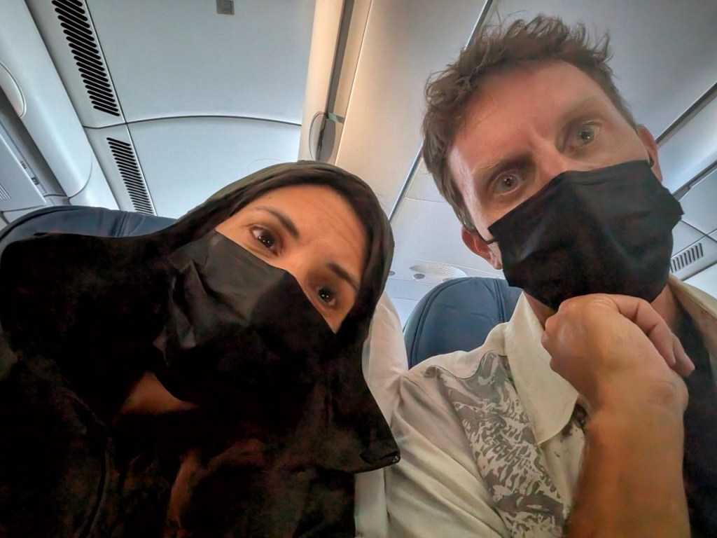 About two hours into the flight, a screaming baby materialized behind us. Where was it before? Did someone just give birth? Then we got stereo sneezing. Someone started watching a children’s show without headphones. The coughing increased in intensity. Flight attendants who were previously revealing their smiling faces masked up in hopes of preventing the already inevitable. This plane is unhinged and we’re all going to get ill, except most of us already are. This is by far the most ill group of people I’ve had to share space with. Sometimes I miss the pandemic when people actually cared about not spreading illness. If you hadn’t already presumed, everyone coughing, sneezing, and dying are not masked up or covering their mouths.