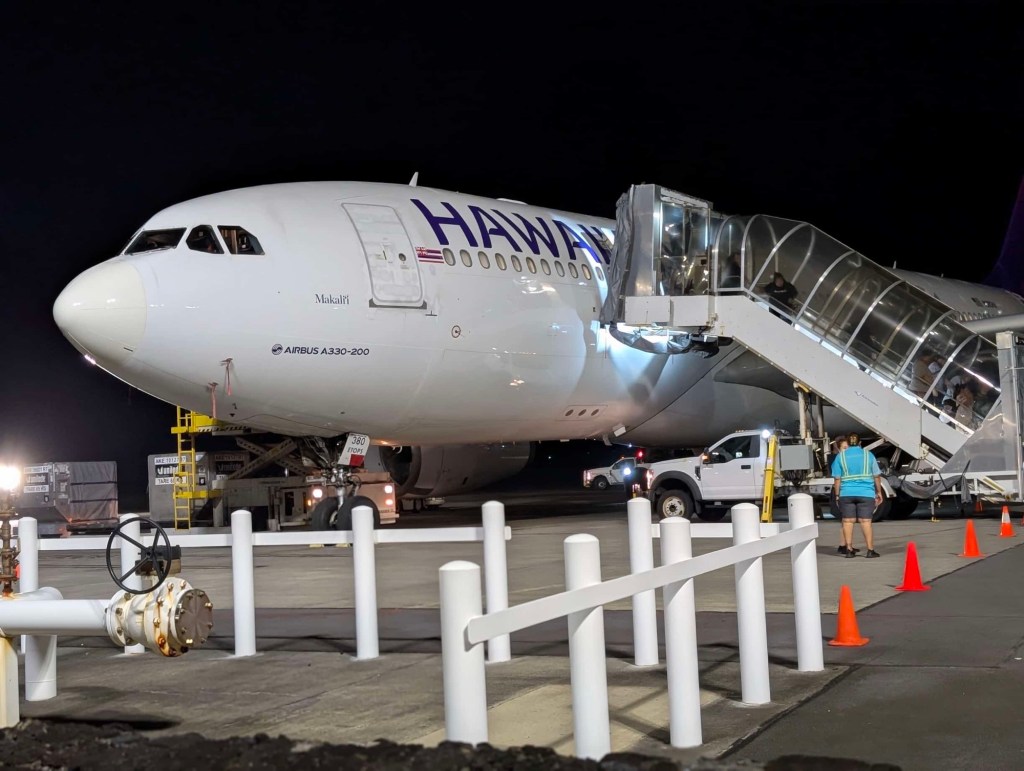 Poor Nicole attempted in vain to relax in the closed-in lounge while multiple people created a symphony of coughing around us. We left the lounge to sit on chairs just outside, where things were a lot quieter and calmer, and we could still access the club’s Wi-Fi. We eventually made our way over to gate A12, where a chorus of coughing continued prior to the boarding of the Hawaiian Airlines A330. As we took note of our future fellow passengers, we remarked that Samoans are not particularly petite individuals. We prepared ourselves to be in a Polynesian sandwich. When we were the very last to be issued seats, about ten minutes after the plane was scheduled to depart, we actually had an open seat next to us. Unfortunately, we were seated directly in front of two annoying children who coughed incessantly throughout the flight.