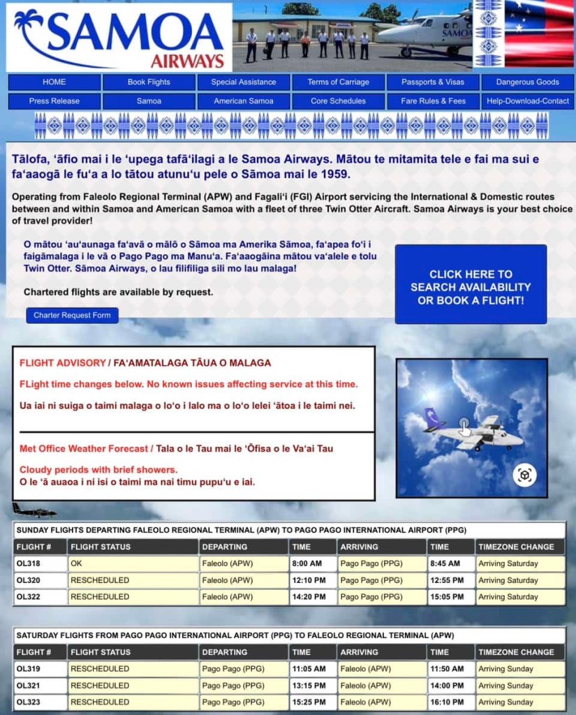 Our morning was a bit elongated thanks to the delay from Samoa Airways. This is evidently not uncommon. Their website looks like an Angelfire website from the 1990s (screenshot below). But the bandwith here isn’t great, so maybe simple is better for the people here on AmSam. We’ll have to see if it’s a similar issue over in Sam.