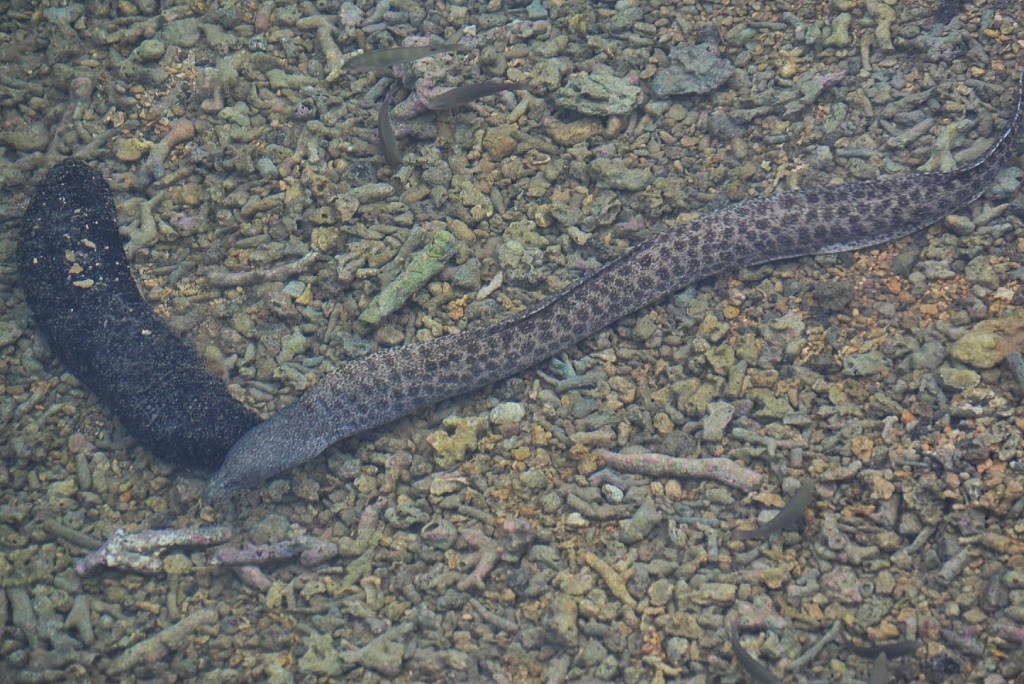 It was all okay. I was expecting to be underwhelmed by the #1 attraction and it met my expectations. Judging by google reviews or TripAdvisor, people love this place, so good for them. They aren’t jaded like Bricole. We headed back to the Aga Reef to recover and relax. As we settled in, we saw this eel slithering around just off our bungalow. I don’t know my eels that well, but I think perhaps it was a Peppered Moray, based on the spots. Perhaps my niece, Emily, would know better.