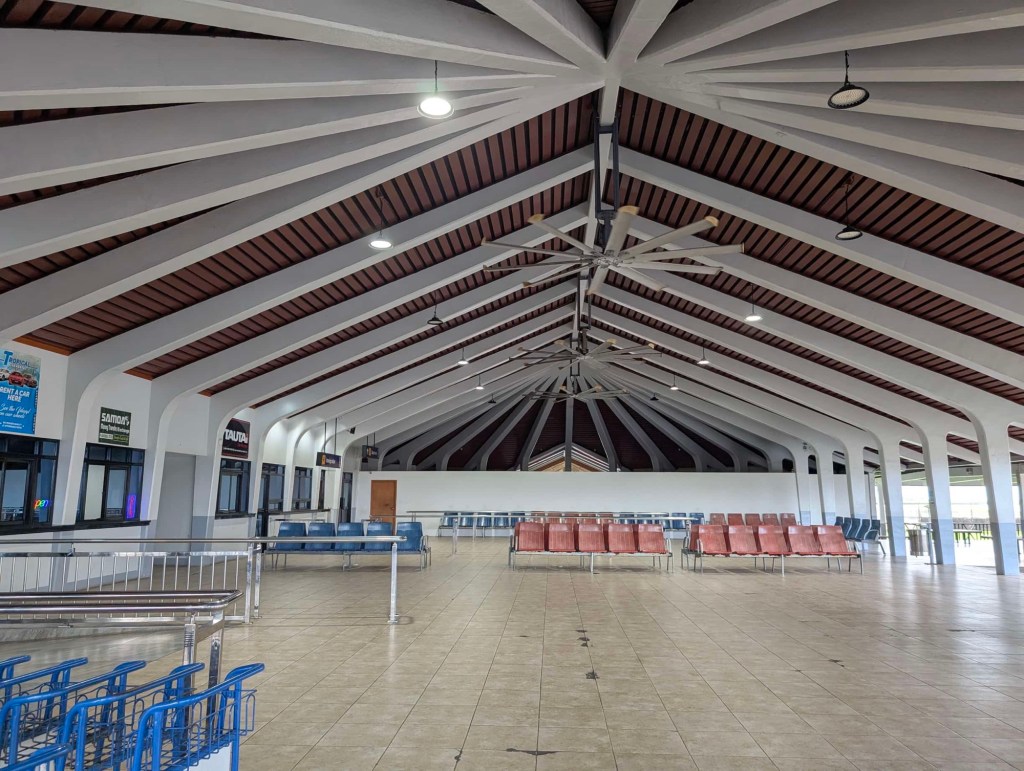 You see, the airport is only a five minute drive from the Tradewinds. Check-in cutoff was at 815am for a 845am flight. We were in the lobby of the Tradewinds around 750am. But they were . . .slow. Then the shuttle was . . .slow. We arrived at the airport terminal around 8:14am and nobody was manning the Samoa Airways counter. Not a good sign. Nicole ran to their office around the corner where they told her check-in was done and then she couldn’t expect to check in for an 845am flight at 845. She showed the actual time on her phone, and then it was all jokes and smiles. I guess island time must have gotten all shaken up with the time warp we went through yesterday. They were able to check our bags no problem and someone even wanted to shake my hand to say, “Have a good flight, Captain.” I guess because they saw the crew tags?