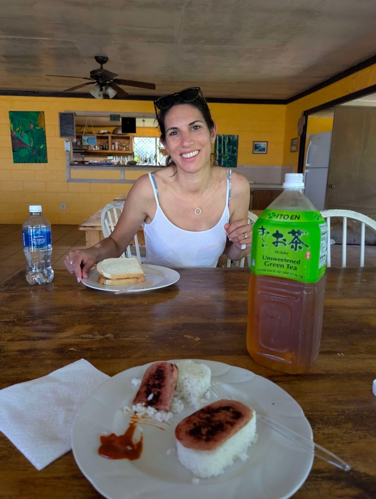 Lunch must be made in house. I made spam musubi and Nicole fixed herself a peanut butter and banana sandwich with the provisions we brought from the market yesterday. Purists will note that I did not wrap the musubi in nori. Well at $8 per packet, you would have forgone this musubi belt as well. Anyway, after our lunch, we relaxed for a bit away from the direct sun while Nicole perused the guestbook that went back to the 1990s. She wondered about the guests who were here on 9/11 as well as the guests who had come from Barrow, Alaska — one isolated extreme to another.