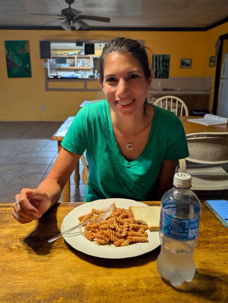 You may recall from an earlier post that the national park exists in part to protect the Samoan fruit bat, which they also call the “flying fox.” They were numerous, but difficult to photograph well as they are dark, quite fast, and flying in a very sunny environment that added a lot of contrast. We walked along the beach for a spell observing the bats with one eye while keeping another eye on the pups. Eventually we rode off back to the Vaoto Lodge to make our dinner. Pasta was the order of the evening. And while it may seem like a hassle to make one’s own food on vacation, Nicole would tell you that the pickings have been mighty slim or inexplicably laced with curry. This might have been the best dinner of the trip for Nicole.